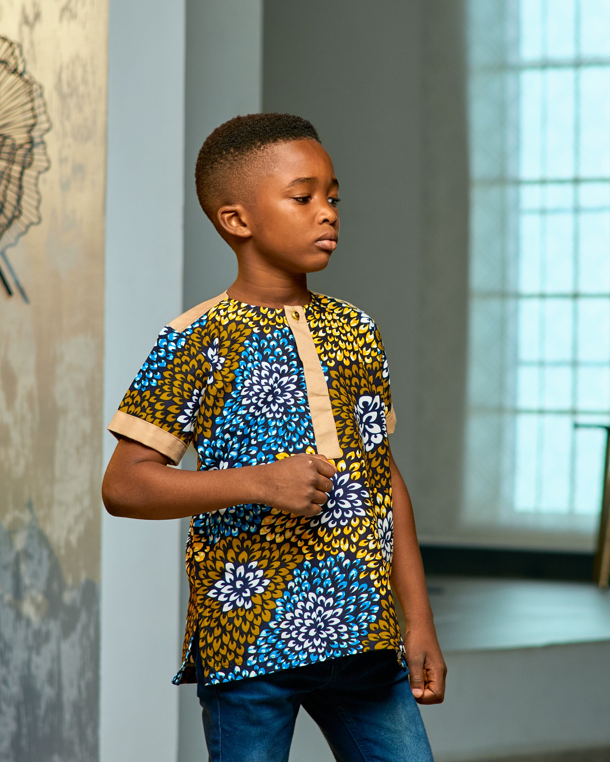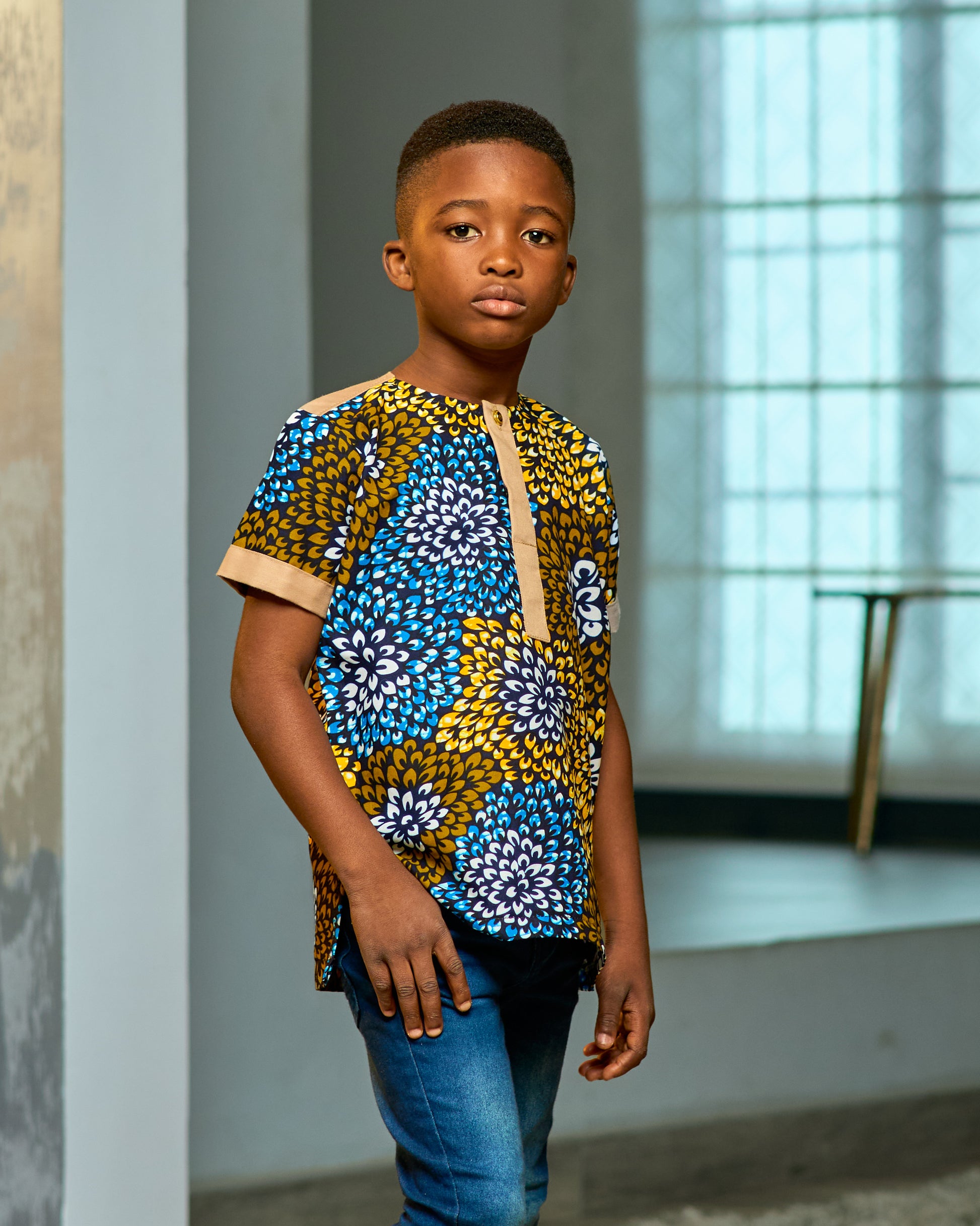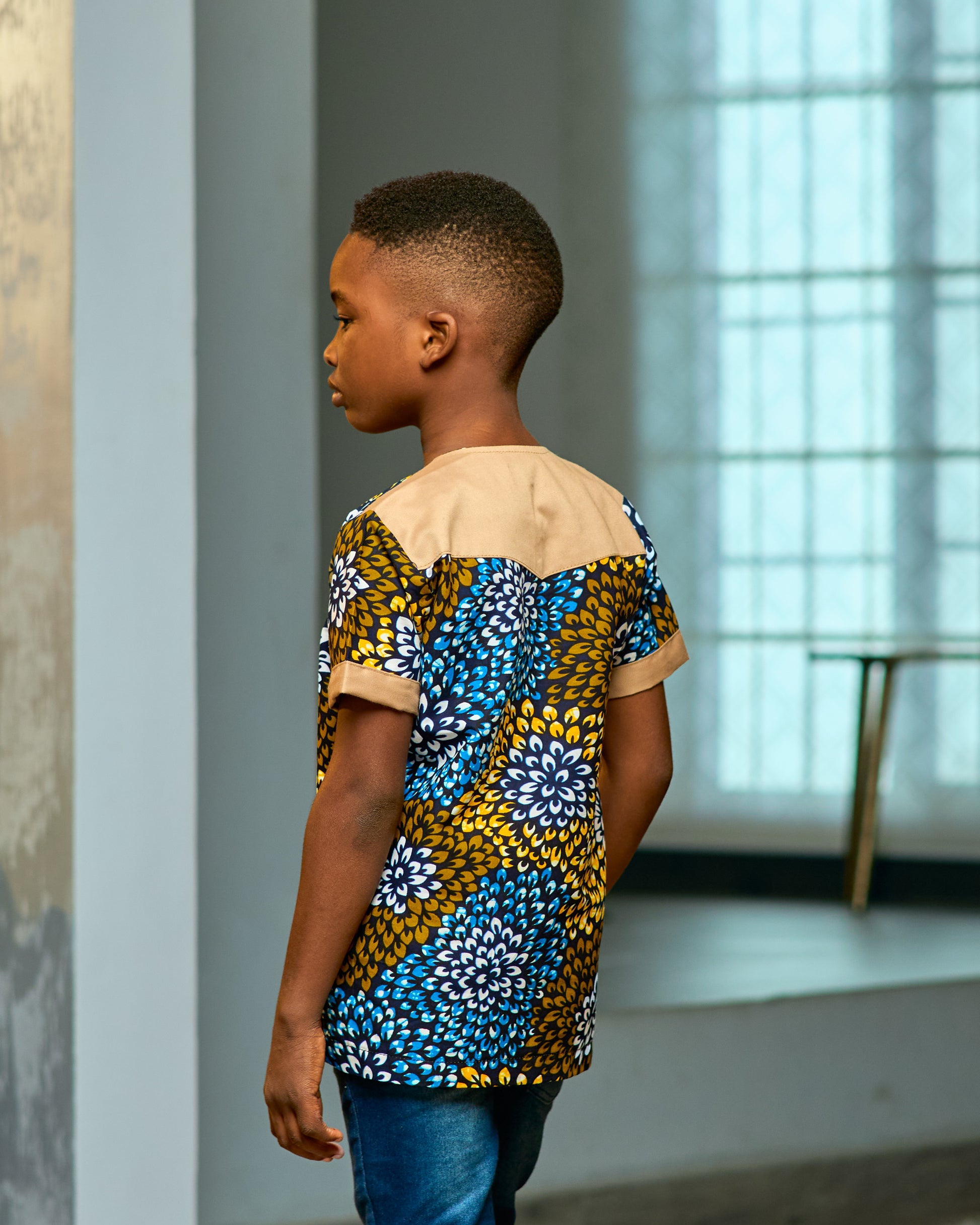 Bright, bold, and beautifully made — this boys’ shirt is a true standout. Featuring wide floral patterns in warm brown, blue, white, and orange tones, it brings a playful twist to traditional style. The subtle khaki details on the sleeve edges and back yoke add a clean, modern finish. It’s the perfect choice for the boy who loves to look smart, stay comfortable, and turn heads wherever he goes.