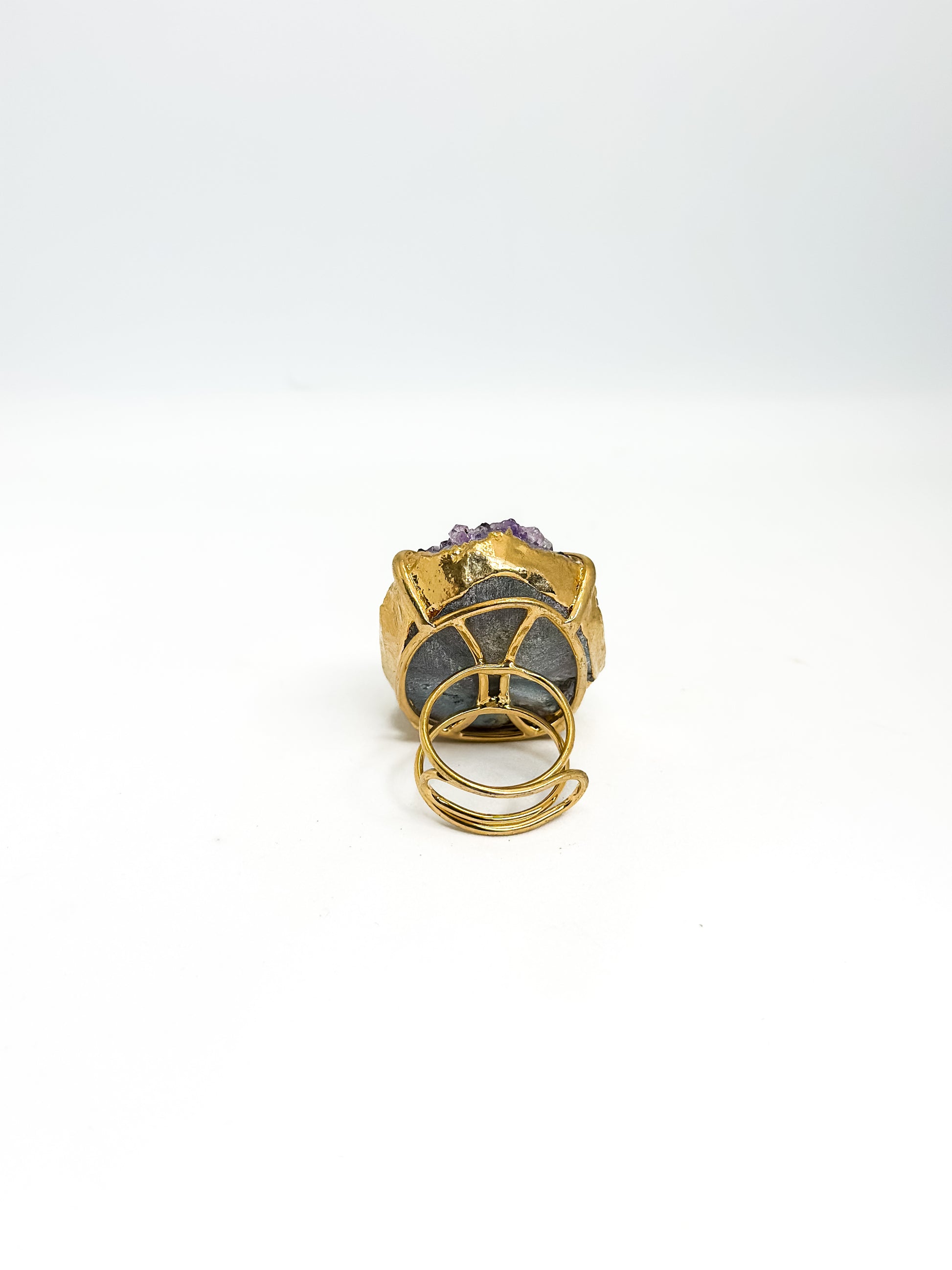 Our Ama Nyarkoa ring features a cluster of deep purple crystals, likely amethyst, set in a gold-toned setting. The ring has a raw, organic look, with the crystals appearing uncut and naturally jagged. The gold setting wraps around the edge, enhancing the natural aesthetic while securely holding the crystals in place with prongs. The background is a clean white, making the ring the clear focal point of the image. It’s bold and striking—definitely a statement piece!