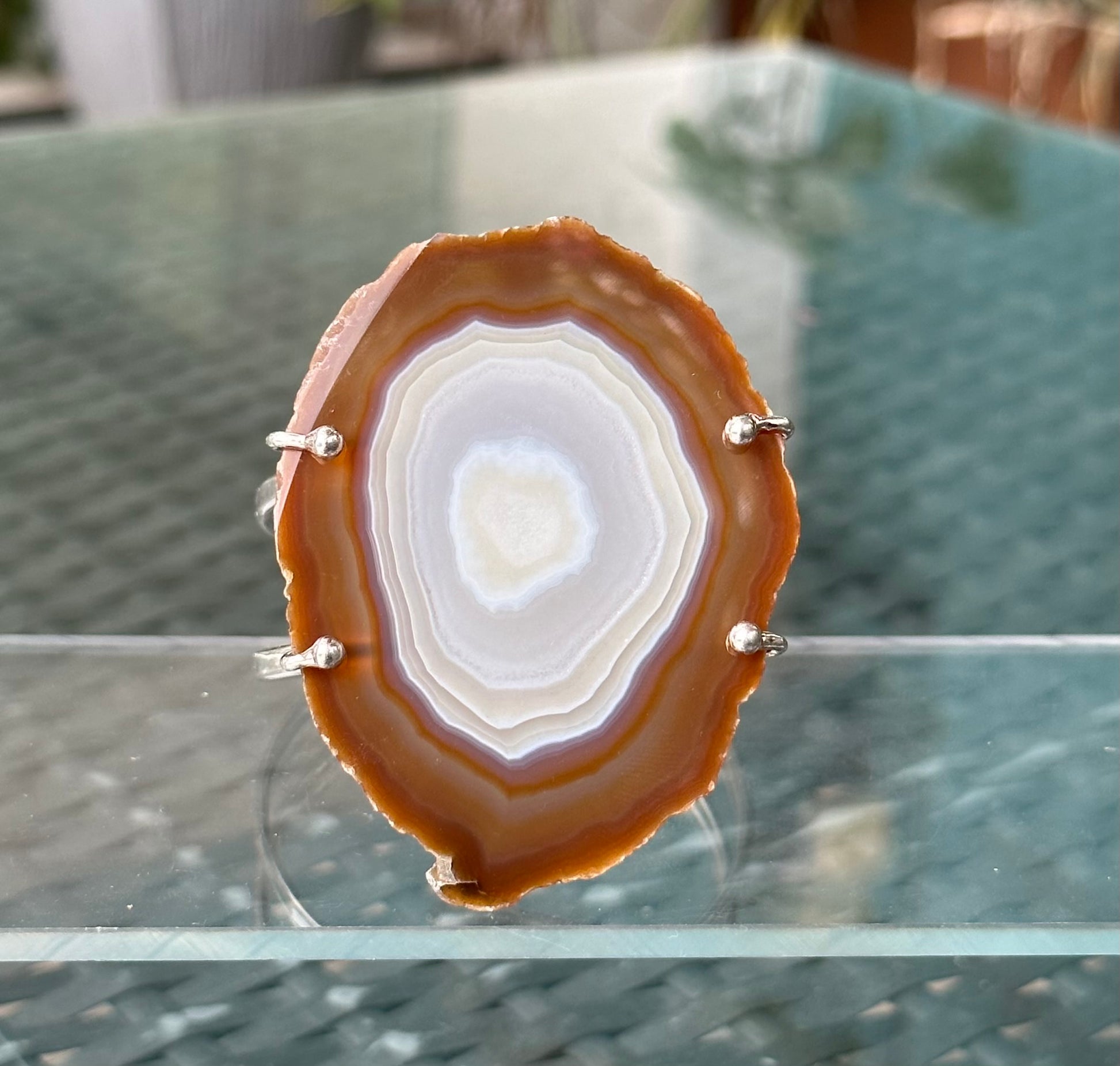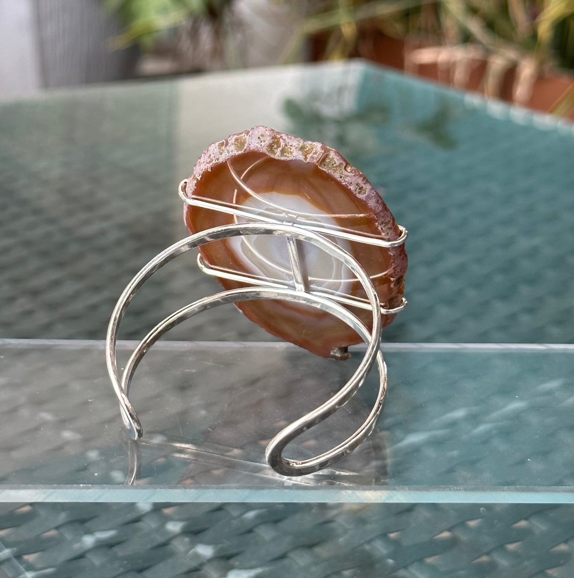 Our agate bracelet showcases a bold agate slice with white patterns running through it.