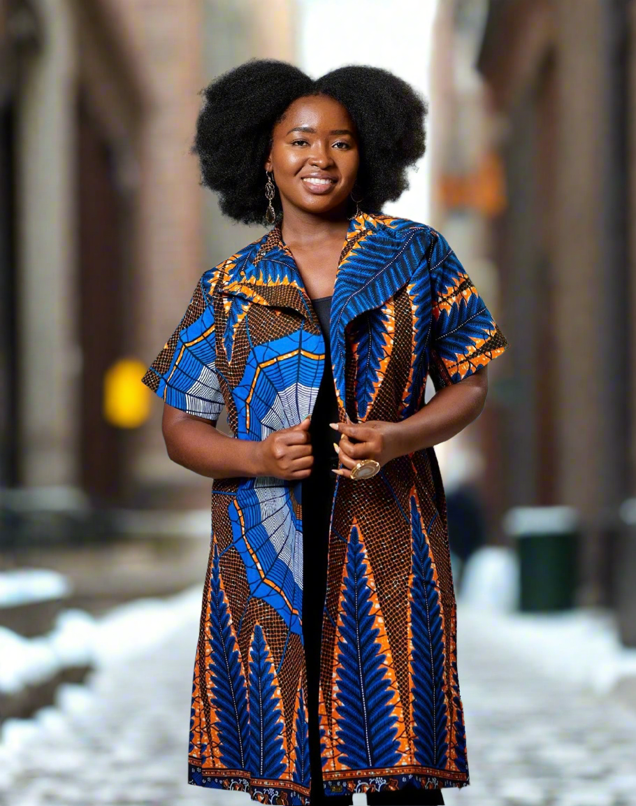 Look sharp while making a unique fashion statement in this striking jacket. Its versatile design allows you to wear it either bottomed up or open to make a bold impression. The traditional African print makes it the perfect accent to any wardrobe, while the long coat provides warmth and style. Add a touch of practicality with the pockets. Stand out and look great!