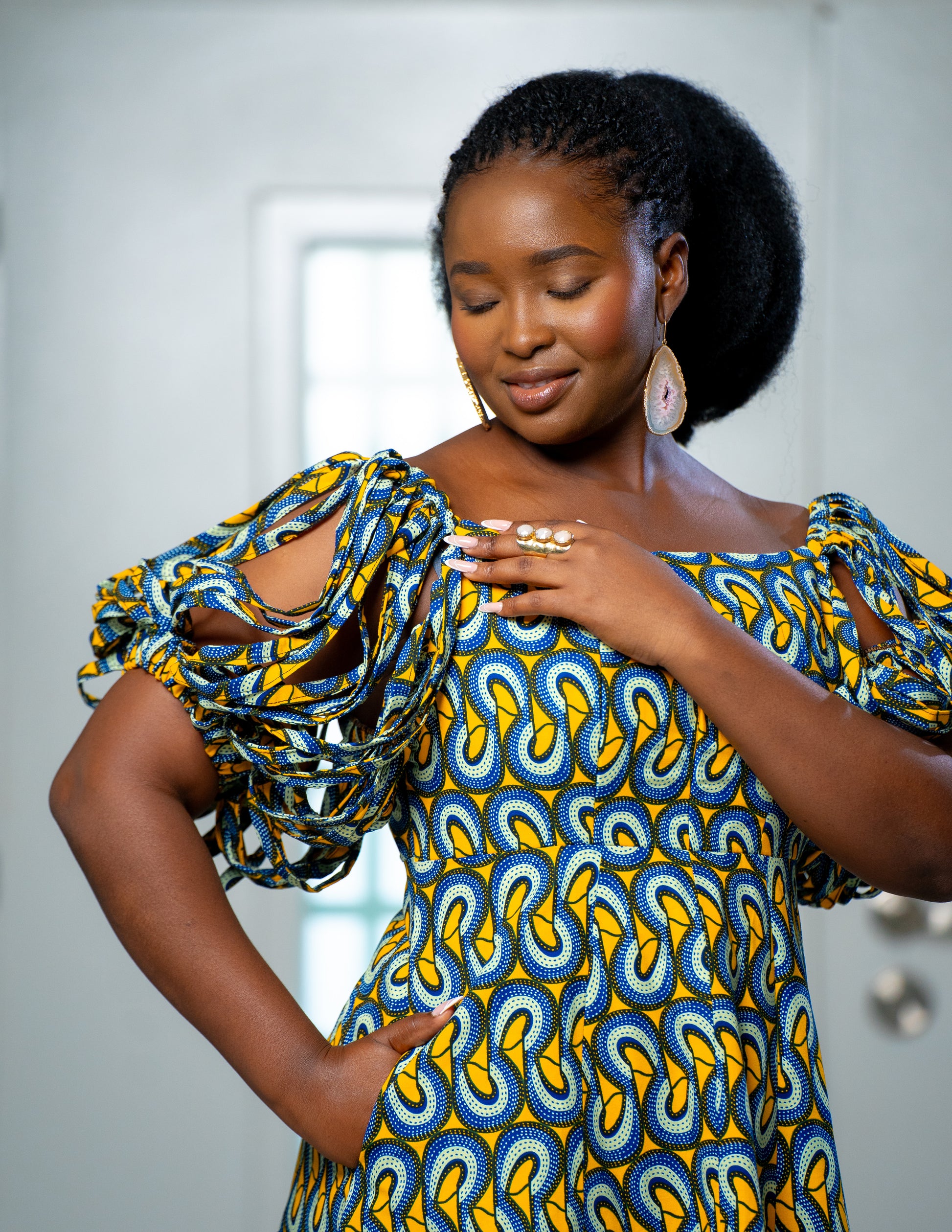 • Fabric: Ankara print with a mix of warm and cool tones.