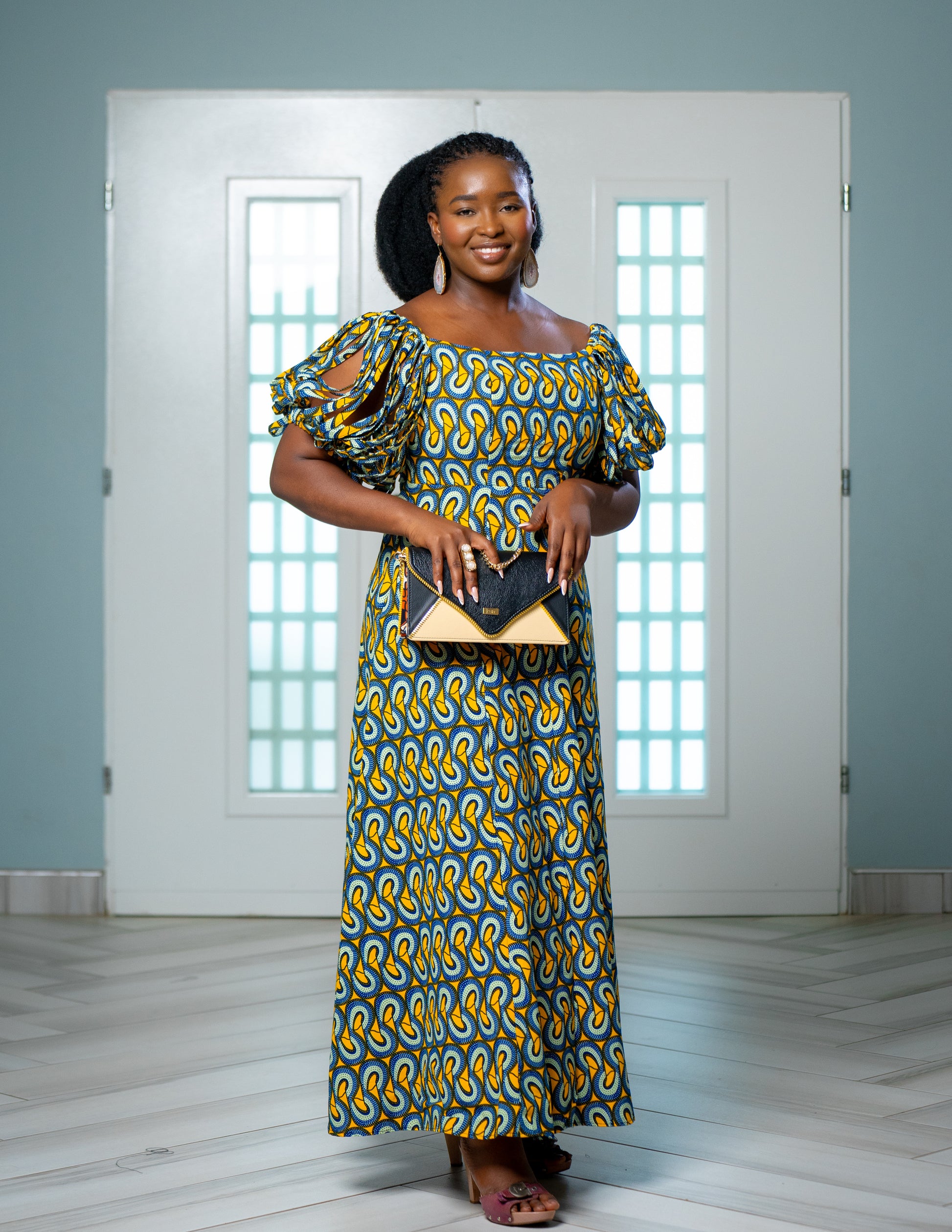 Introducing our cut-out maxi dress,an off-the-shoulder, floor-length gown made from vibrant Ankara (African wax print) fabric. The pattern consists of bold mustard, purple, and black geometric designs.