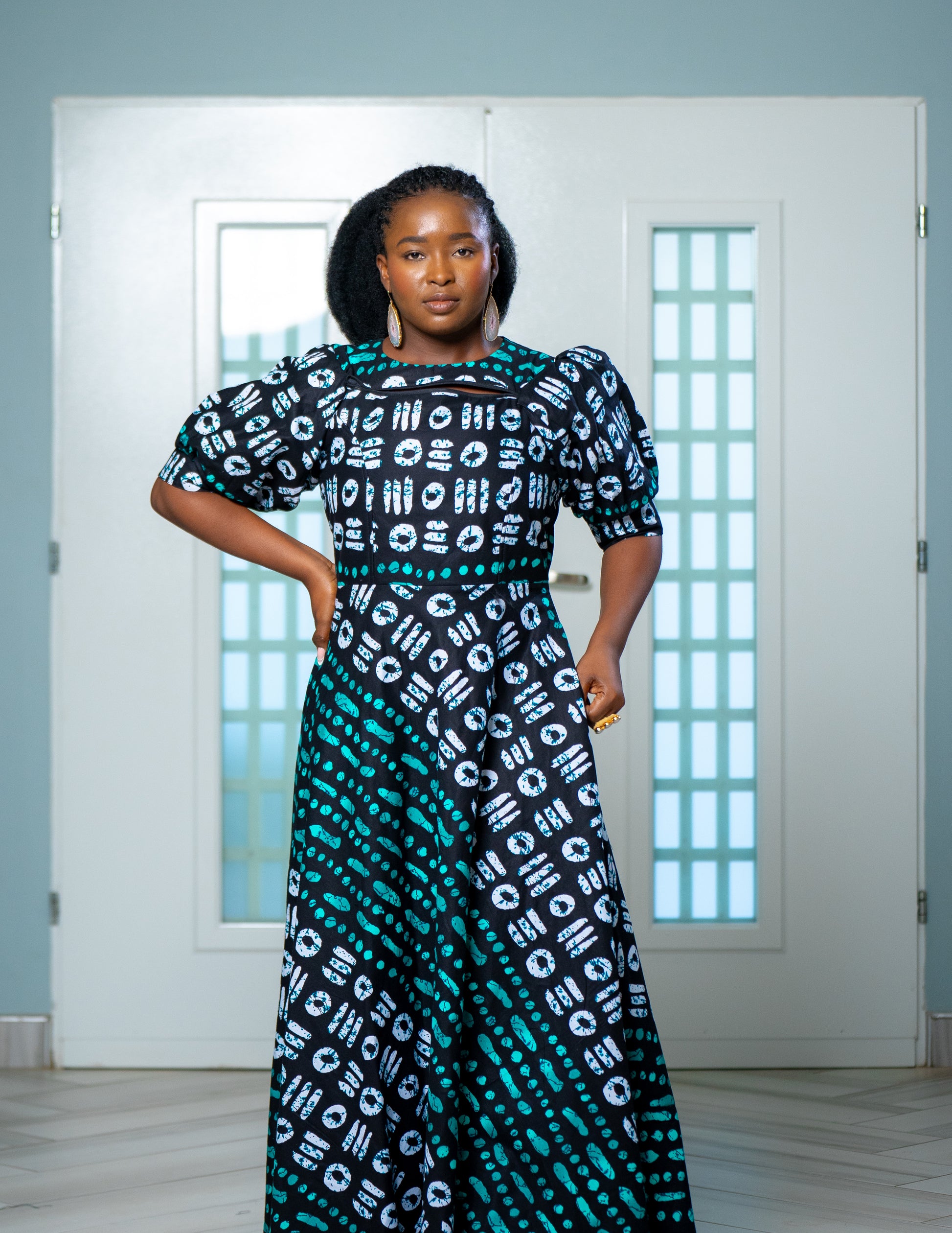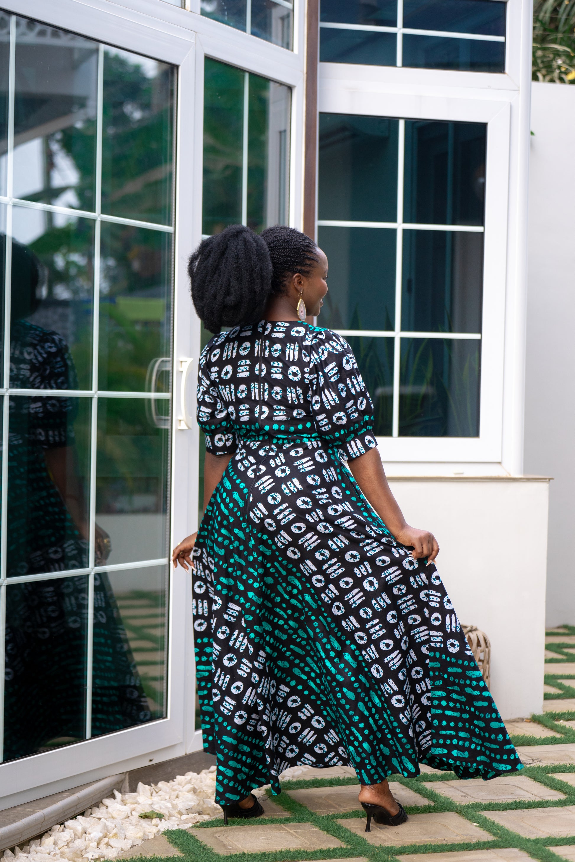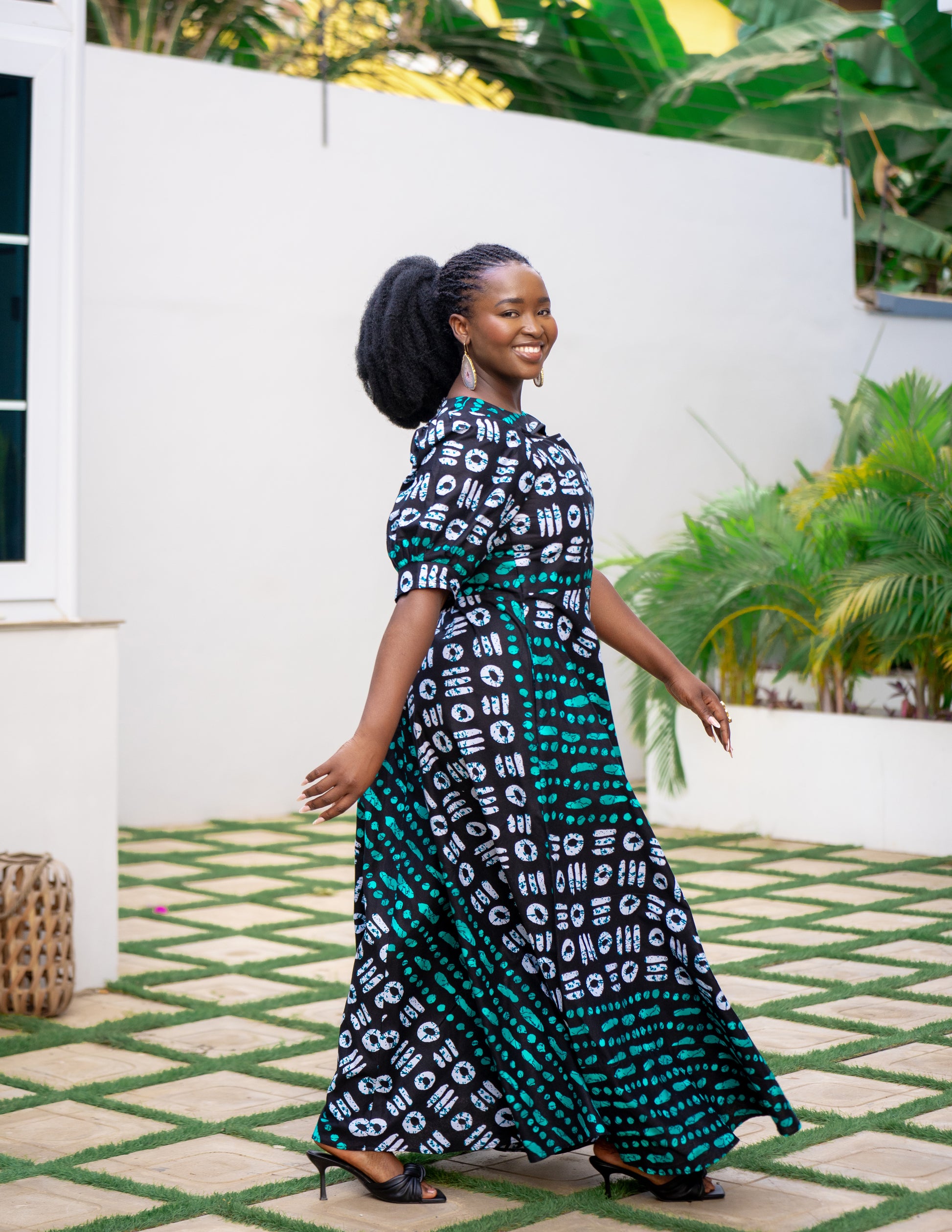 A bold and elegant maxi dress in black with a striking green and white pattern. It features puffed sleeves, a high neckline with a small cutout detail, and a flowing skirt. The design is sophisticated yet comfortable, perfect for formal or semi-formal events.