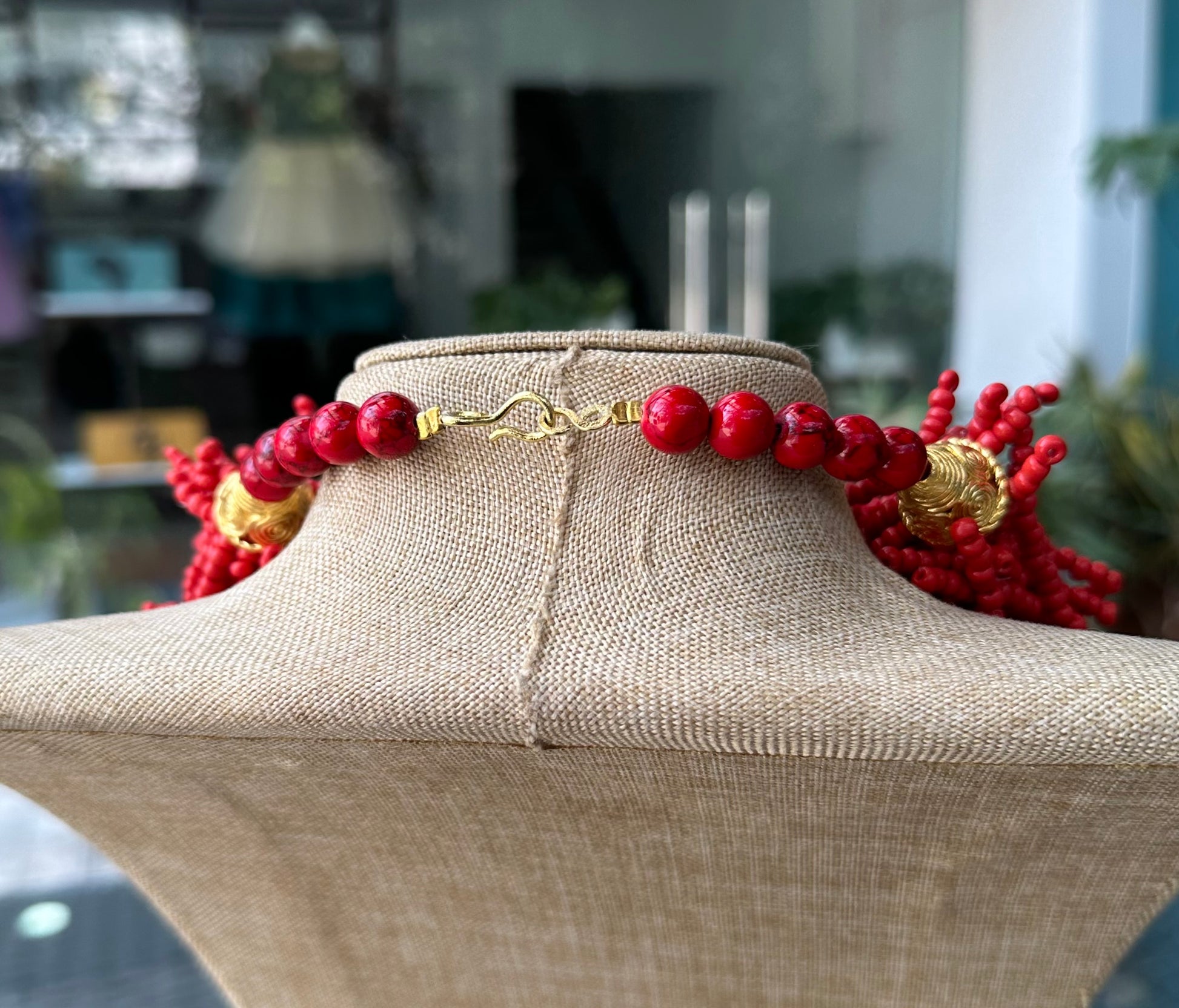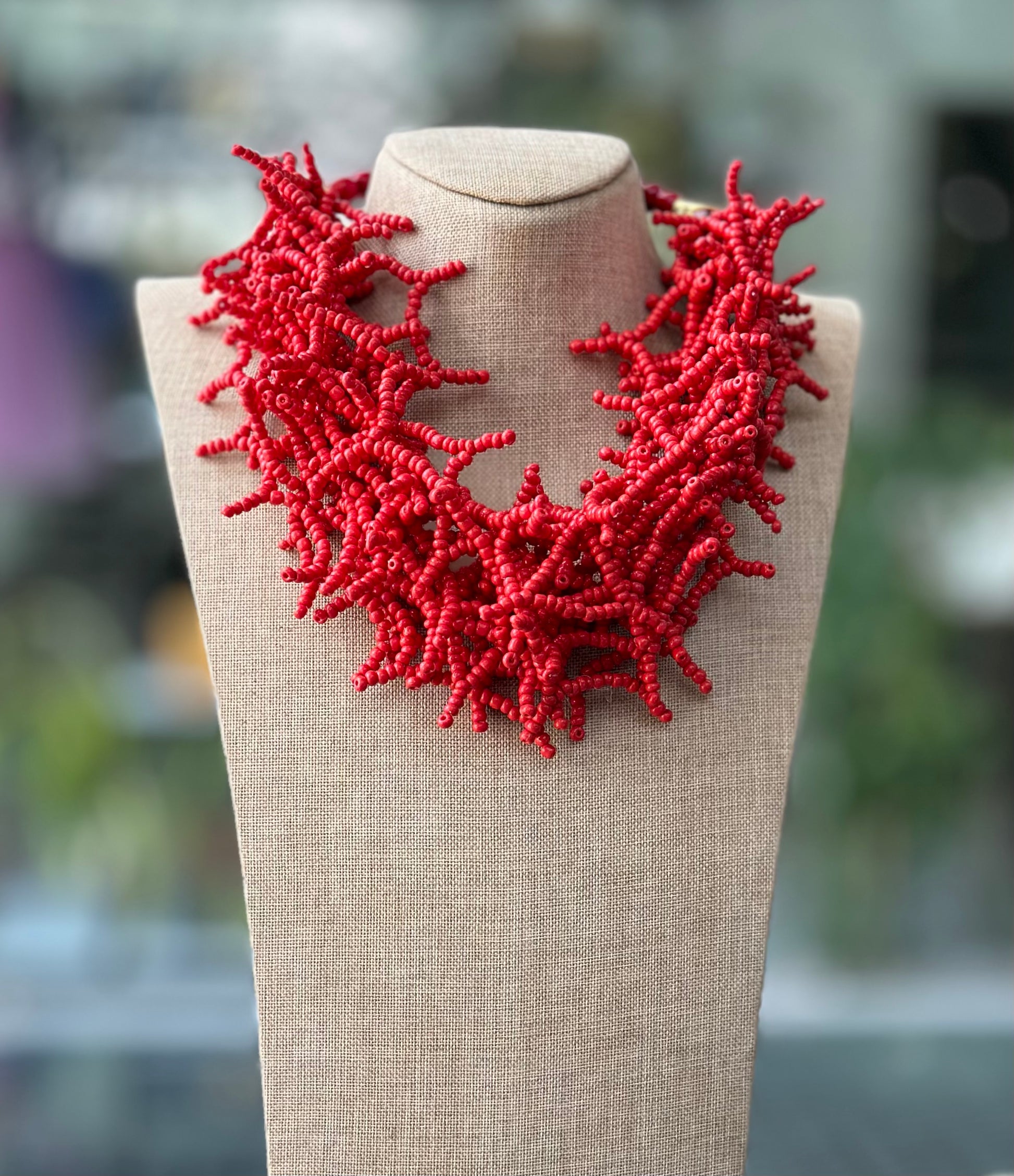 Make a lasting impression with this bold, intricate piece made entirely of small red beads. The beads are arranged in a dense, textured pattern, creating a voluminous, clustered look that adds depth and character. This design has a statement-making presence, with the clusters giving it a unique, organic feel.