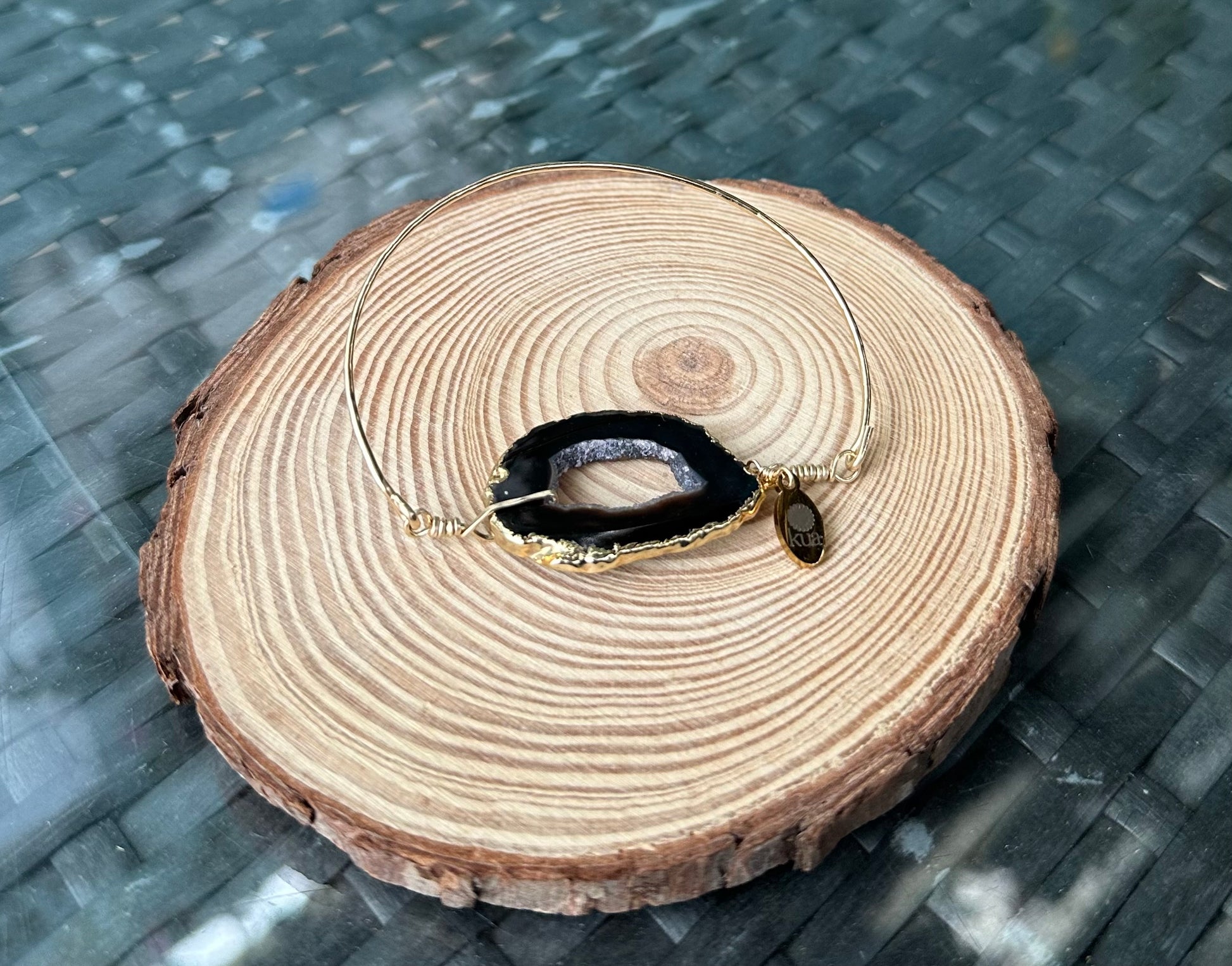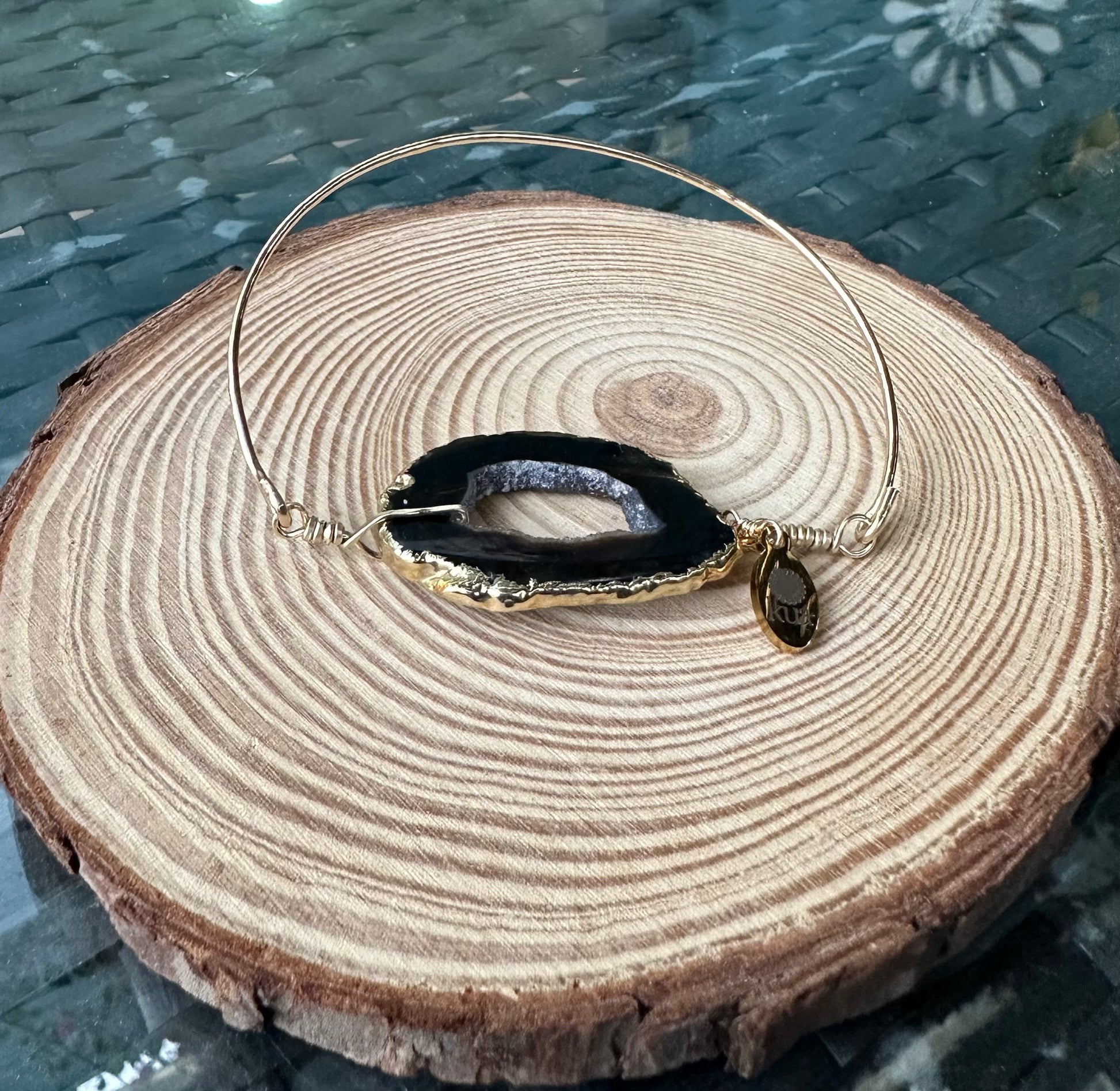 Introducing our stone and wire bracelet featuring a central slice of agate in black,framed in gold.