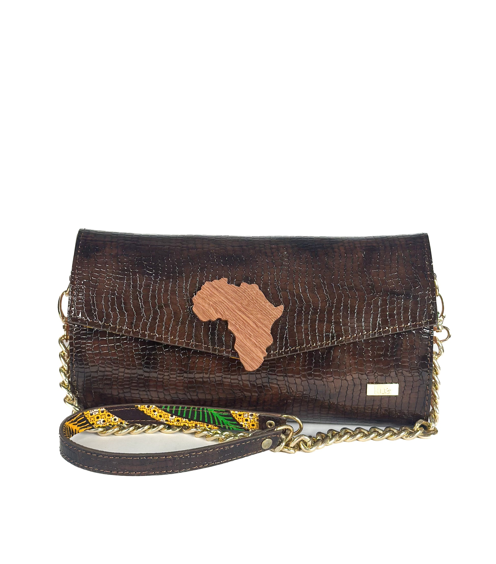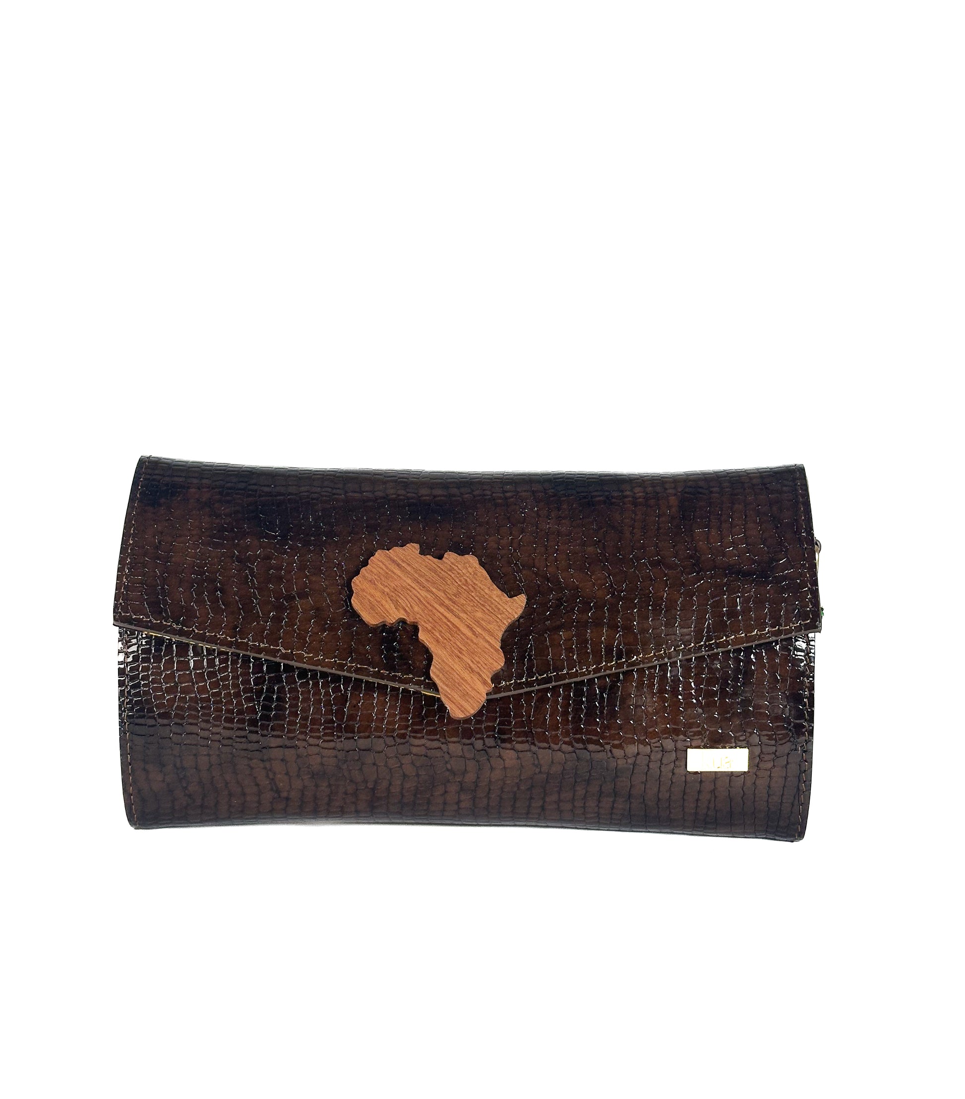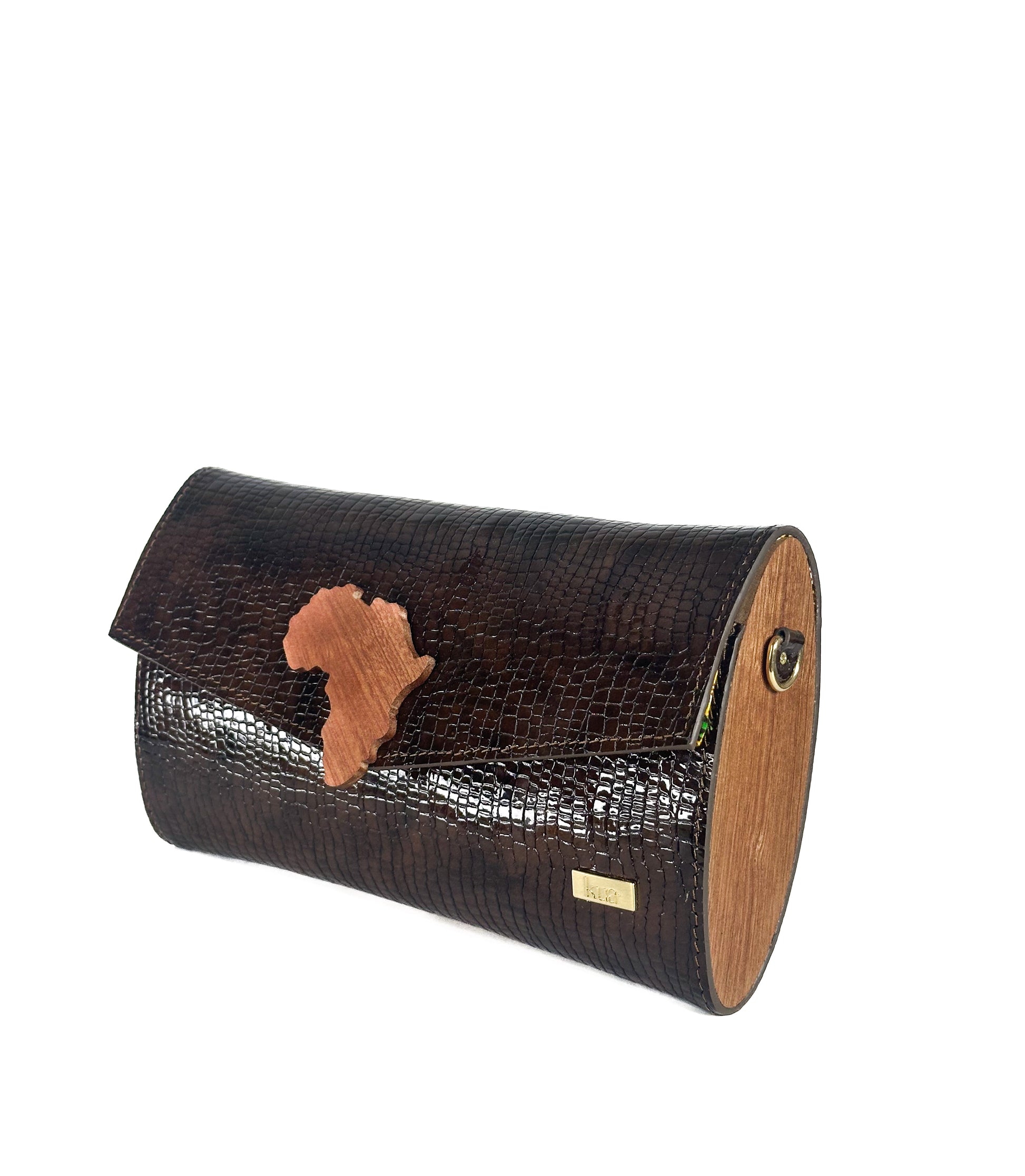Crafted with intention and pride, the Ekuba Oya Clutch is a celebration of heritage, sustainability, and slow fashion. Handmade in Ghana using repurposed leather, this statement piece features an Africa shaped emblem on the flap and elegant side panels carved from Guarea wood — a premium, responsibly sourced African hardwood known for its strength and beauty.