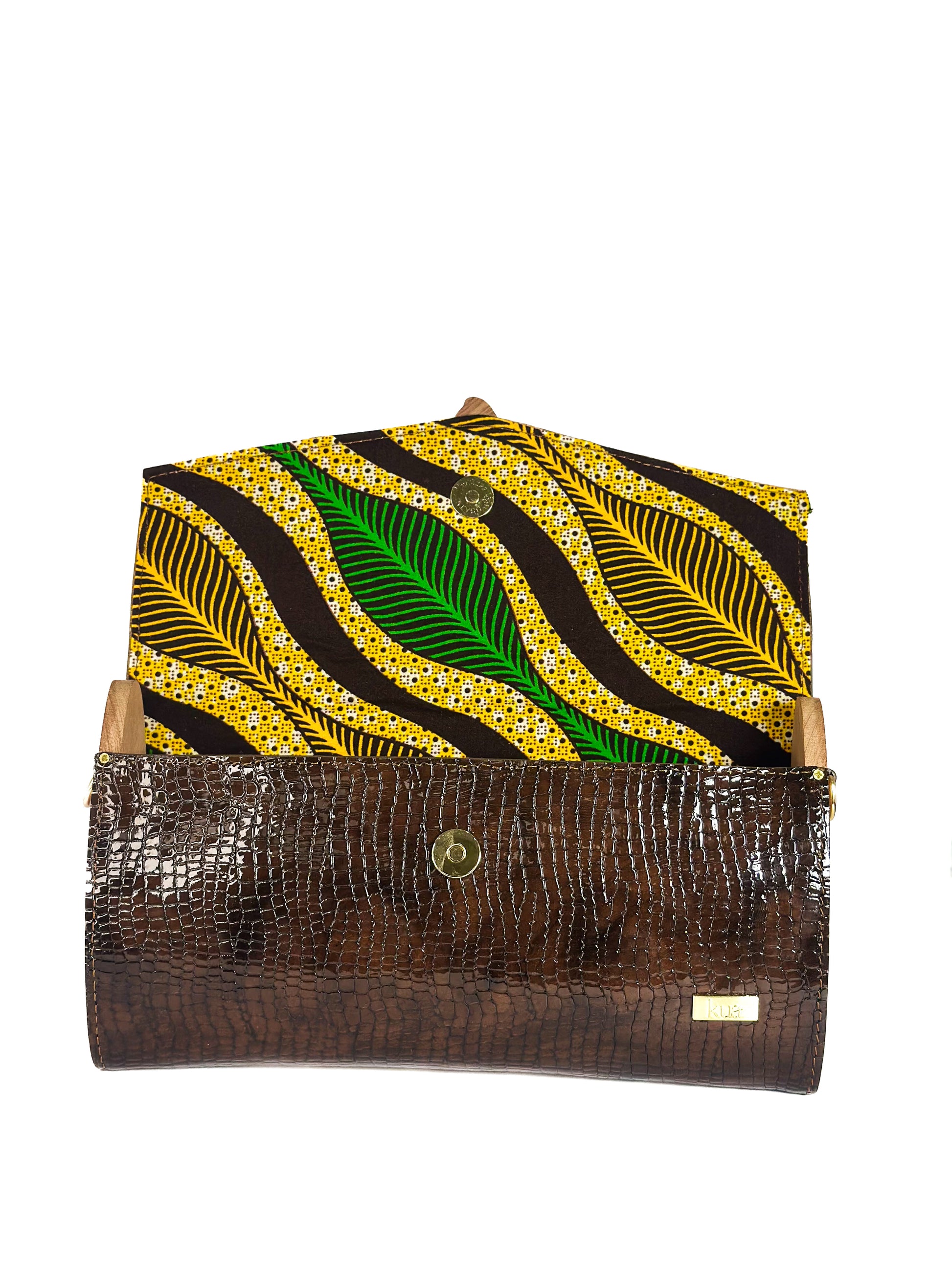 Lined with vibrant African print fabric and finished with a gold chain strap wrapped in textile detail, this clutch merges traditional craftsmanship with contemporary elegance.