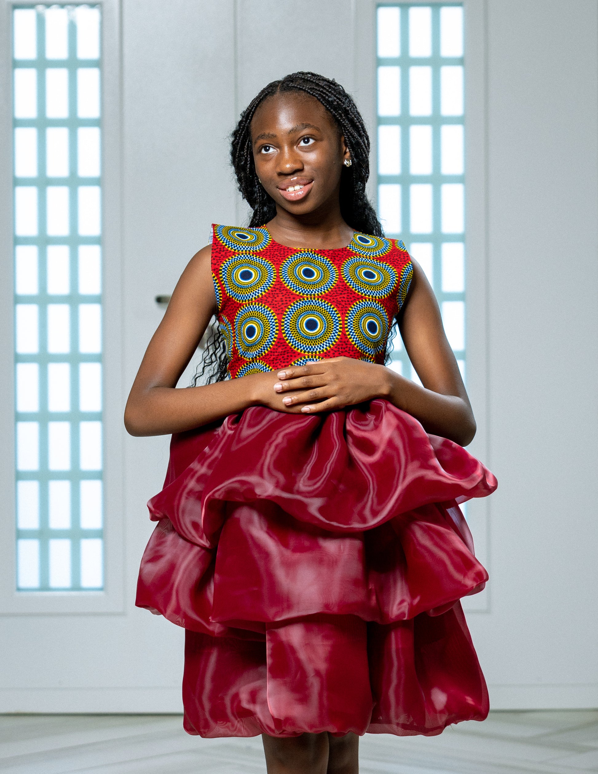 This beautiful dress is perfect for fancy dinners, starlit photos, holiday parties, and more! It features a fitted bodice and a layered organza skirt. We handpick each piece of African print fabric from our local market and craft the dresses from scratch, finding joy in each stitch as we create adorable clothing that impacts the lives of our employees. With your support, you help us promote independence, sustainability, and authenticity.