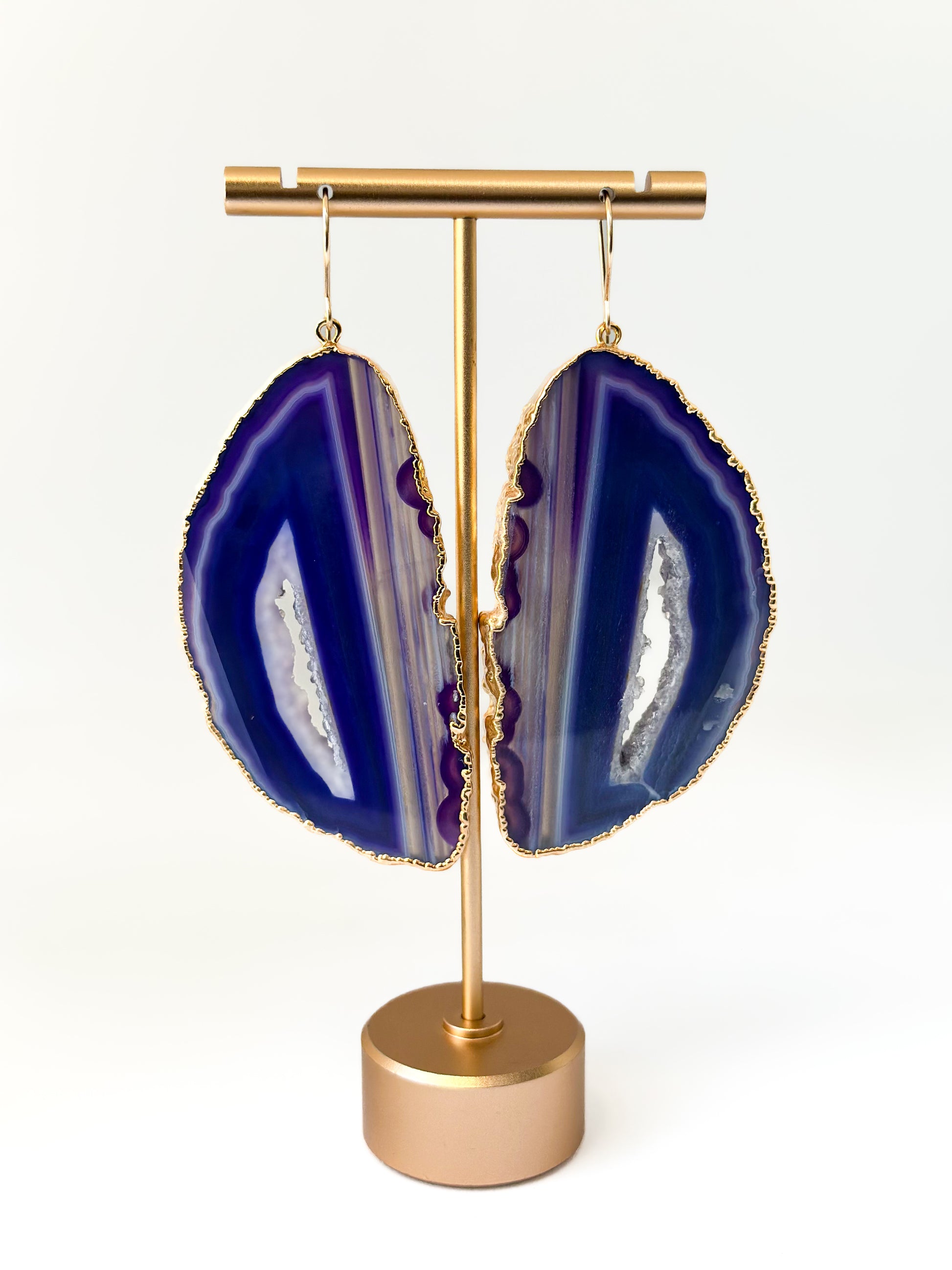 Add a pop of unique style to your outfit with the Esi Waayi Statement Earrings! These bold navy blue earrings are accented with eye-catching purple, white, and light beige patterns. The gold plated details add a touch of luxury, while the slight cut open hole in the middle adds a touch of intrigue. Elevate your look with these statement earrings!