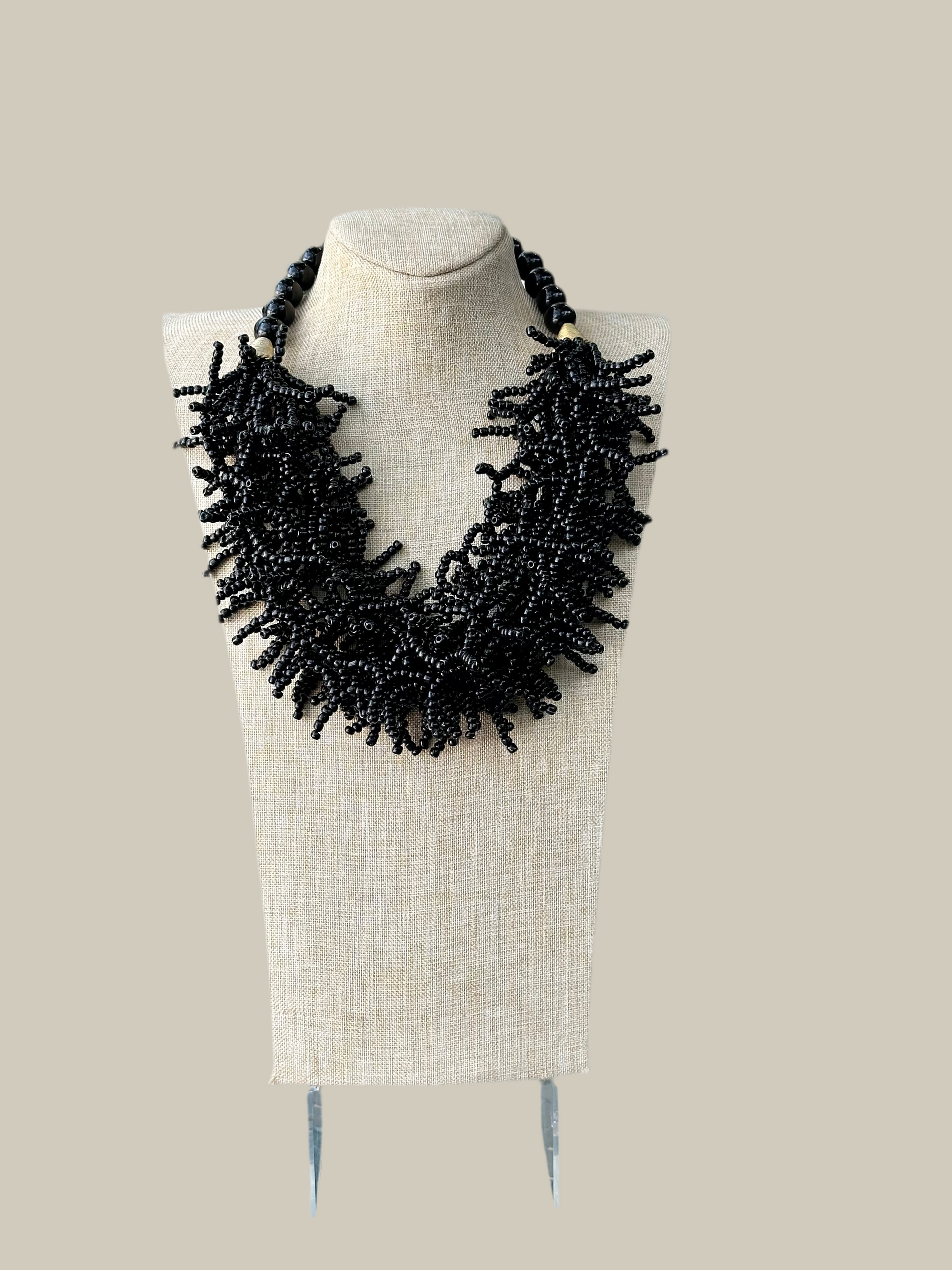 Stand out effortlessly with our Bold Black Clustered Bead Necklace, an intricate statement piece designed to capture attention. Entirely handcrafted from small red recycled glass beads, each bead is meticulously arranged into dense clusters, creating a voluminous, textured appearance. Complemented by stylish brass components, this necklace adds an organic elegance to your look. Each piece is handmade, supporting Ghanaian artisans and sustainable fashion practices. Perfect for adding depth and character to any outfit.