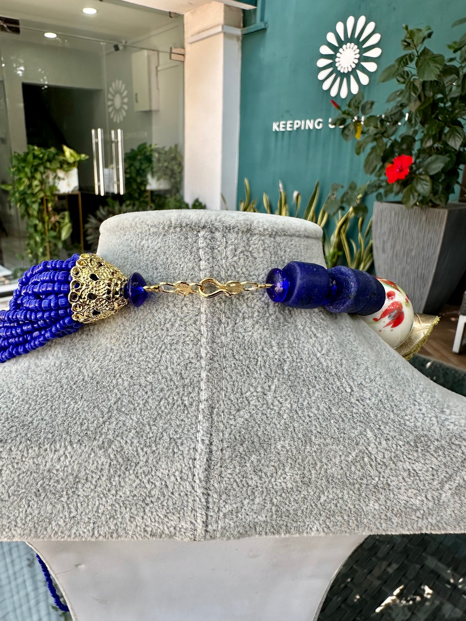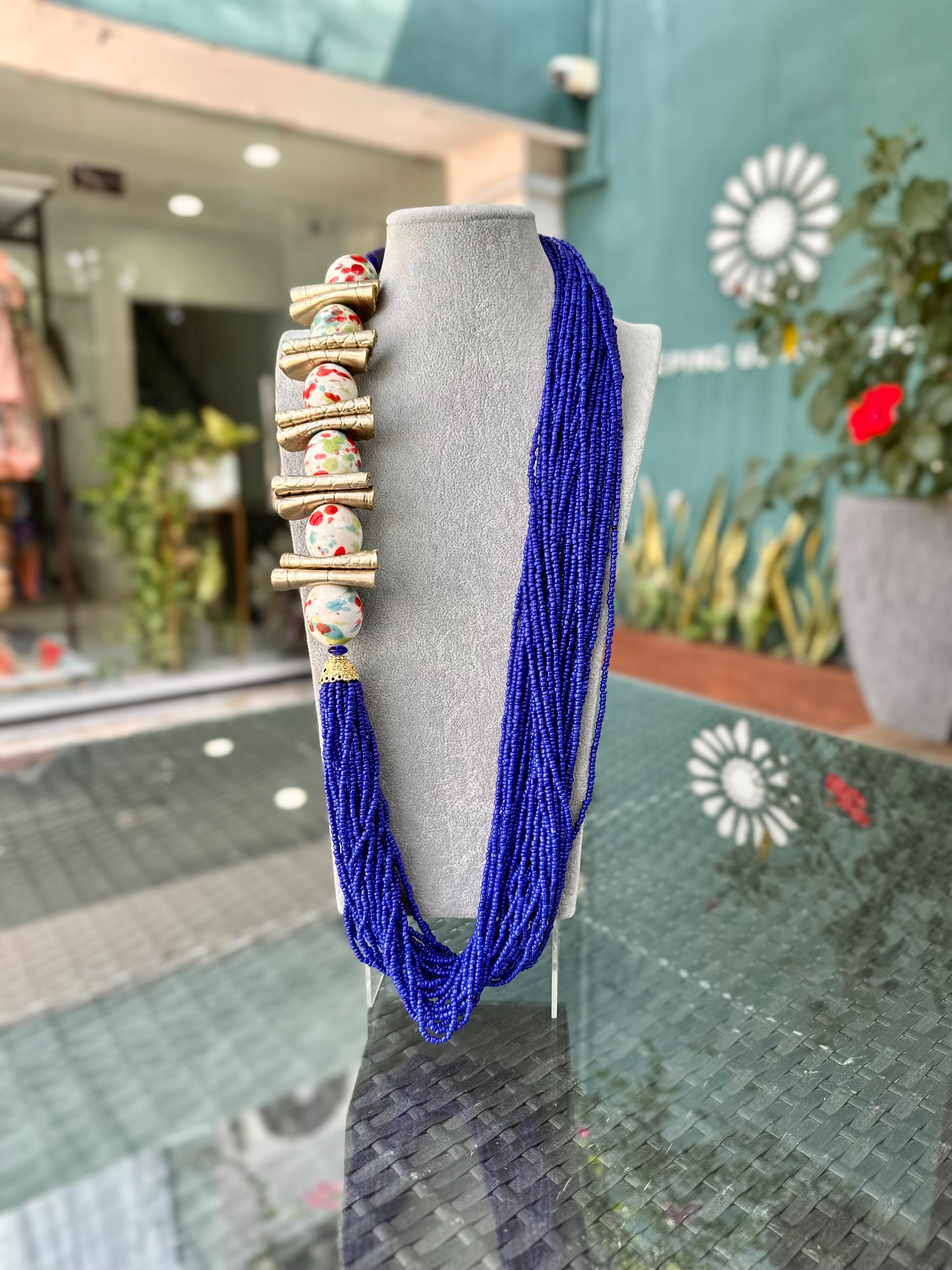 Elevate your wardrobe with this striking multi-strand blue beaded necklace. Featuring a creative mix of smooth marbled beads and sculptural matte accents, this piece is the perfect blend of tradition and modern artistry. Whether styled with a dress or layered over a simple top, it instantly adds a bold, confident touch to any look.