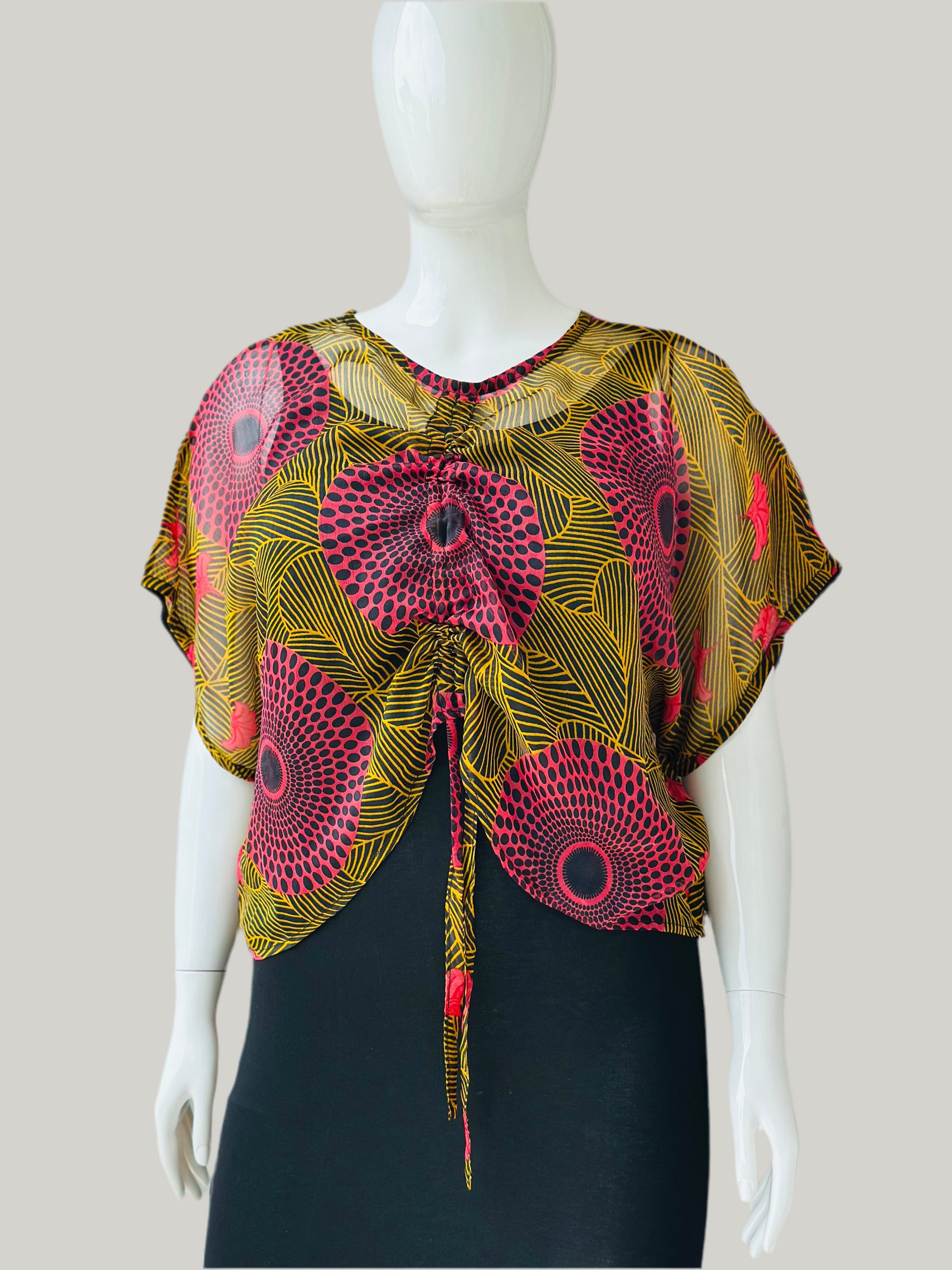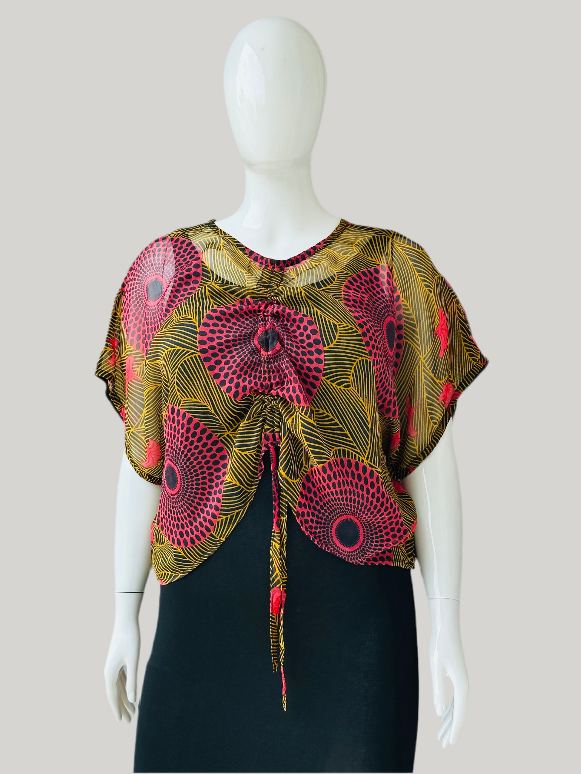 Introducing our loose-fitting, flowy blouse with a detailed patterned design. It features a gathered drawstring detail at the center front, creating a cinched effect. The short, wide sleeves and lightweight fabric give it a relaxed and airy appearance, making it versatile for various occasions.