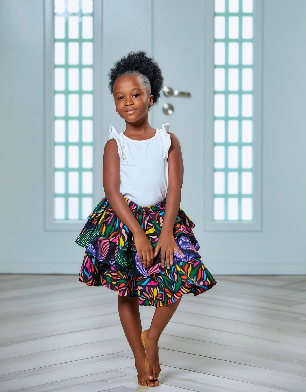 Introducing our vibrant 3-layered African print skirt for girls. This colorful skirt features an elastic waist for a comfortable and flexible fit. The layers showcase eye-catching African prints, making it a lively and stylish choice for any occasion. Perfect for adding a splash of color to her wardrobe.