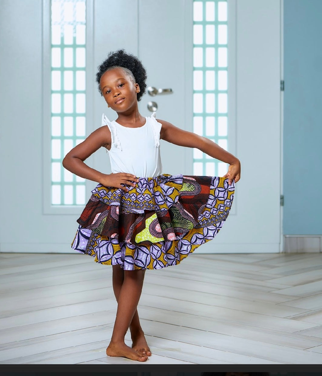 Introducing our vibrant 3-layered African print skirt for girls. This colorful skirt features an elastic waist for a comfortable and flexible fit. The layers showcase eye-catching African prints, making it a lively and stylish choice for any occasion. Perfect for adding a splash of color to her wardrobe.