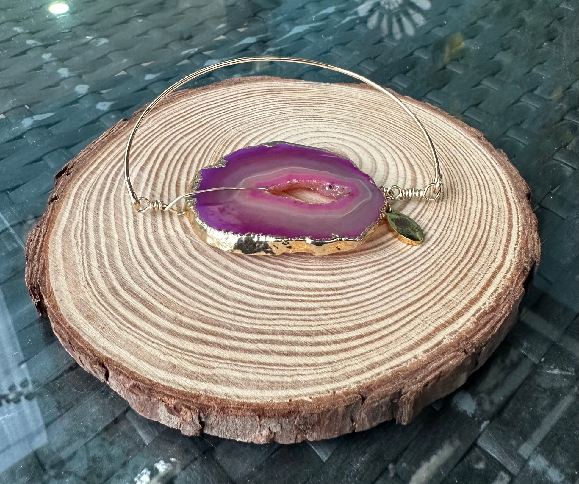 Introducing our stone and wire bracelet featuring a central slice of agate pink hues,framed in gold.