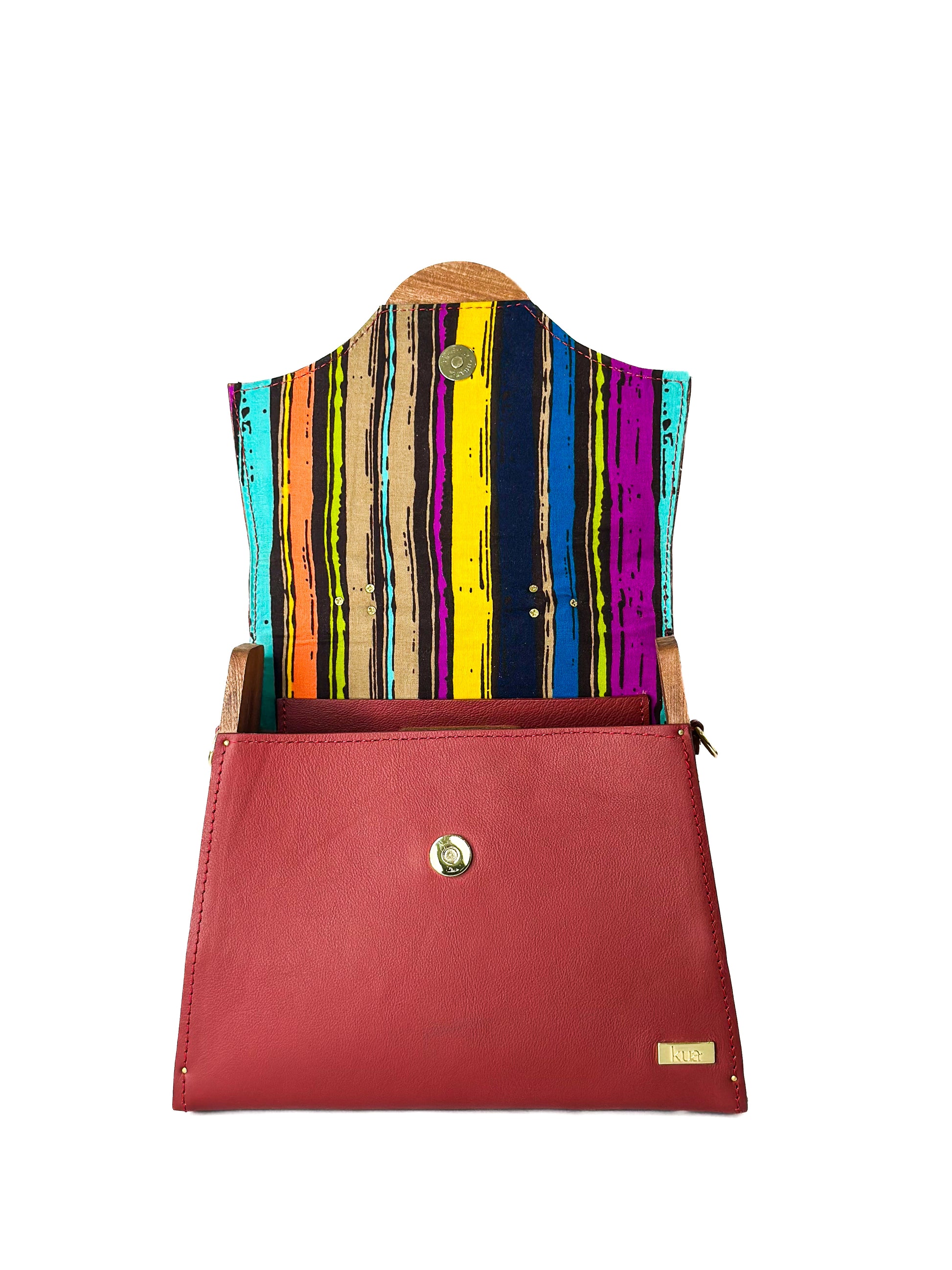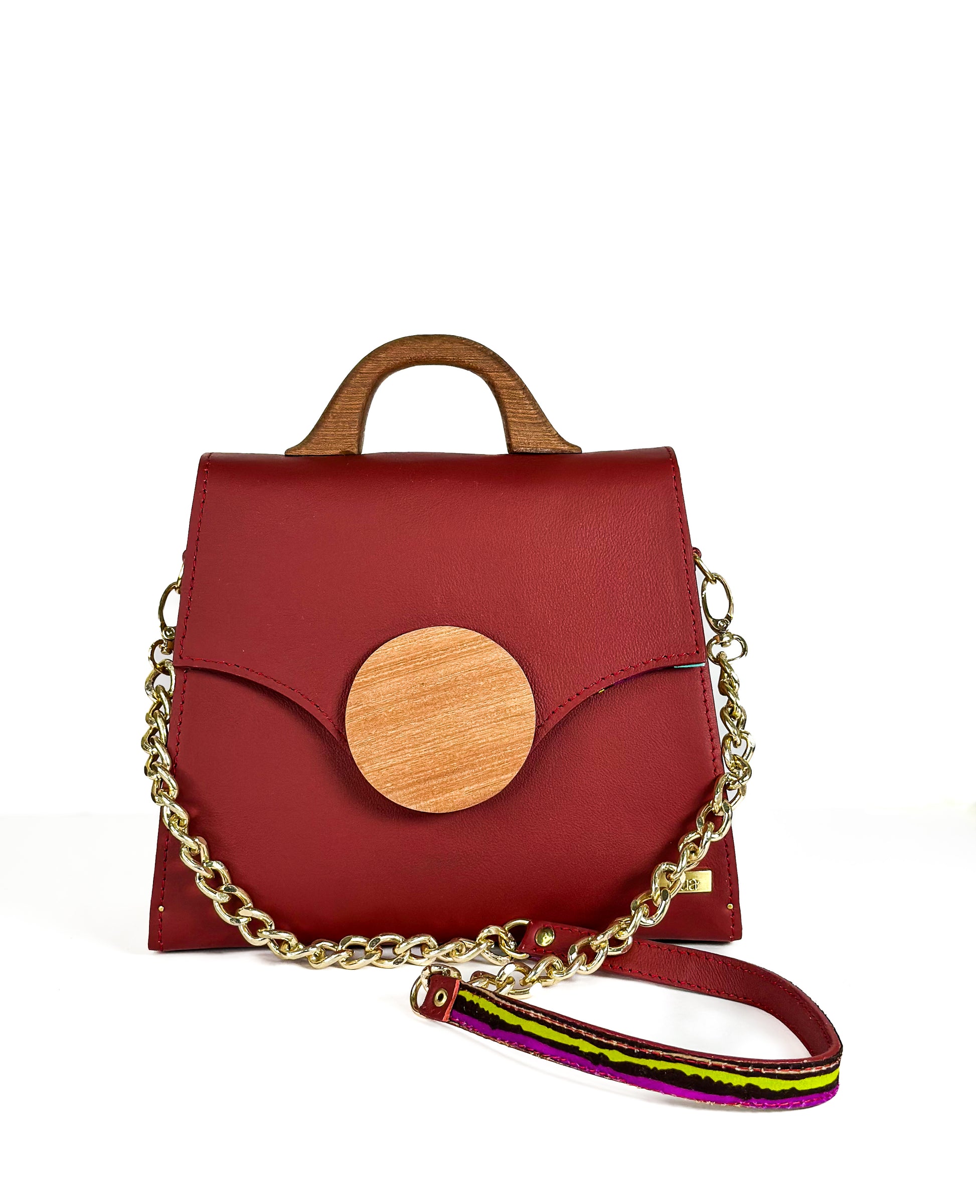 The bold yet refined silhouette is balanced by a wooden handle that feels as good as it looks, while a gold chain strap wrapped in African print fabric adds versatility and soul to the design.