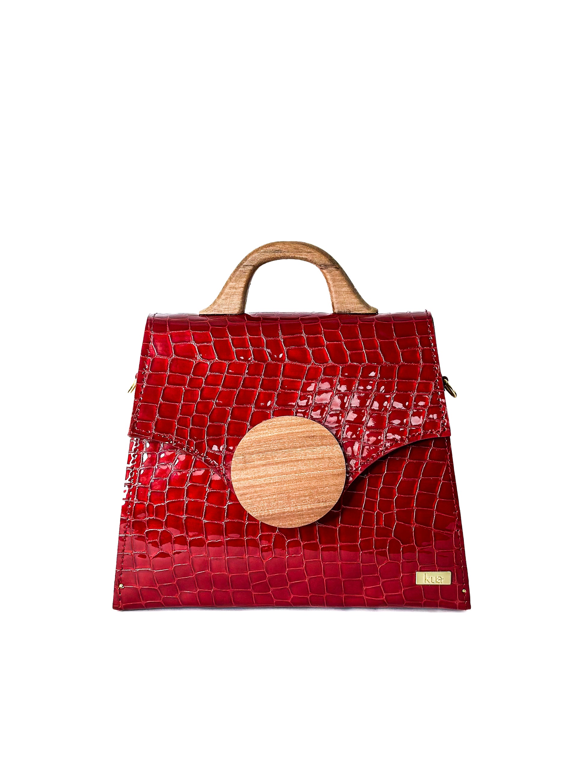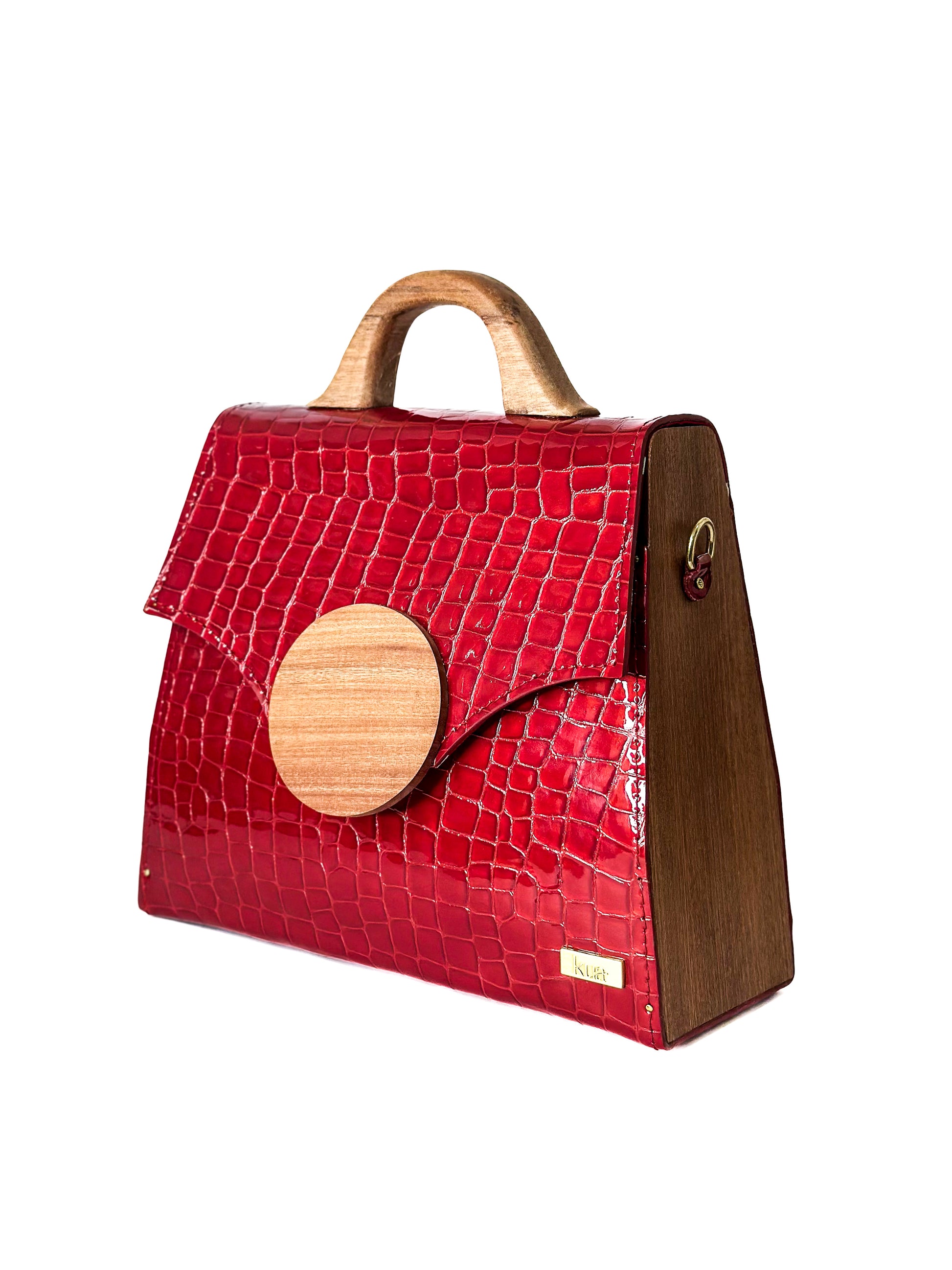 - Exterior: Red snake-like textured leather accented by guarea wood emblem