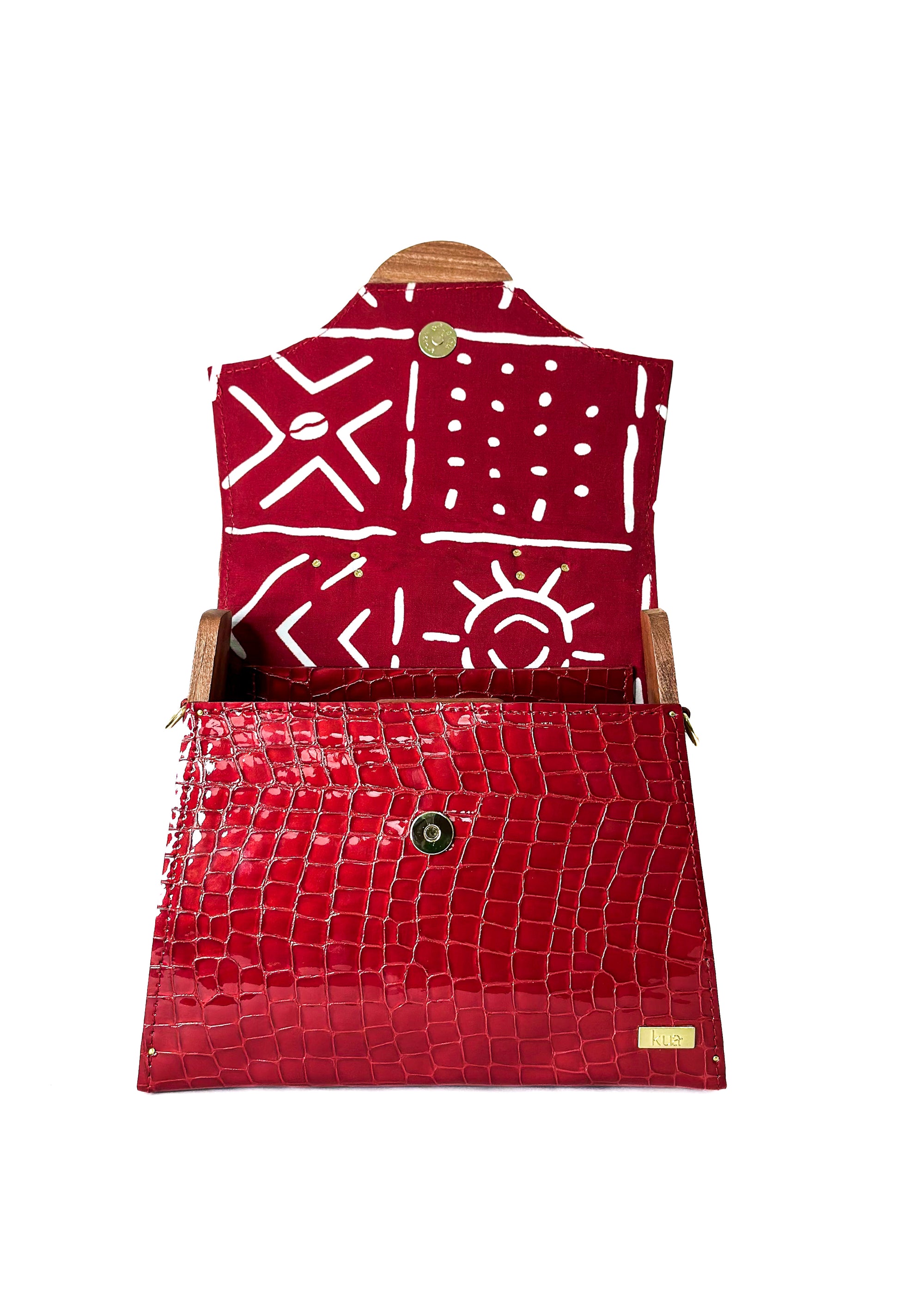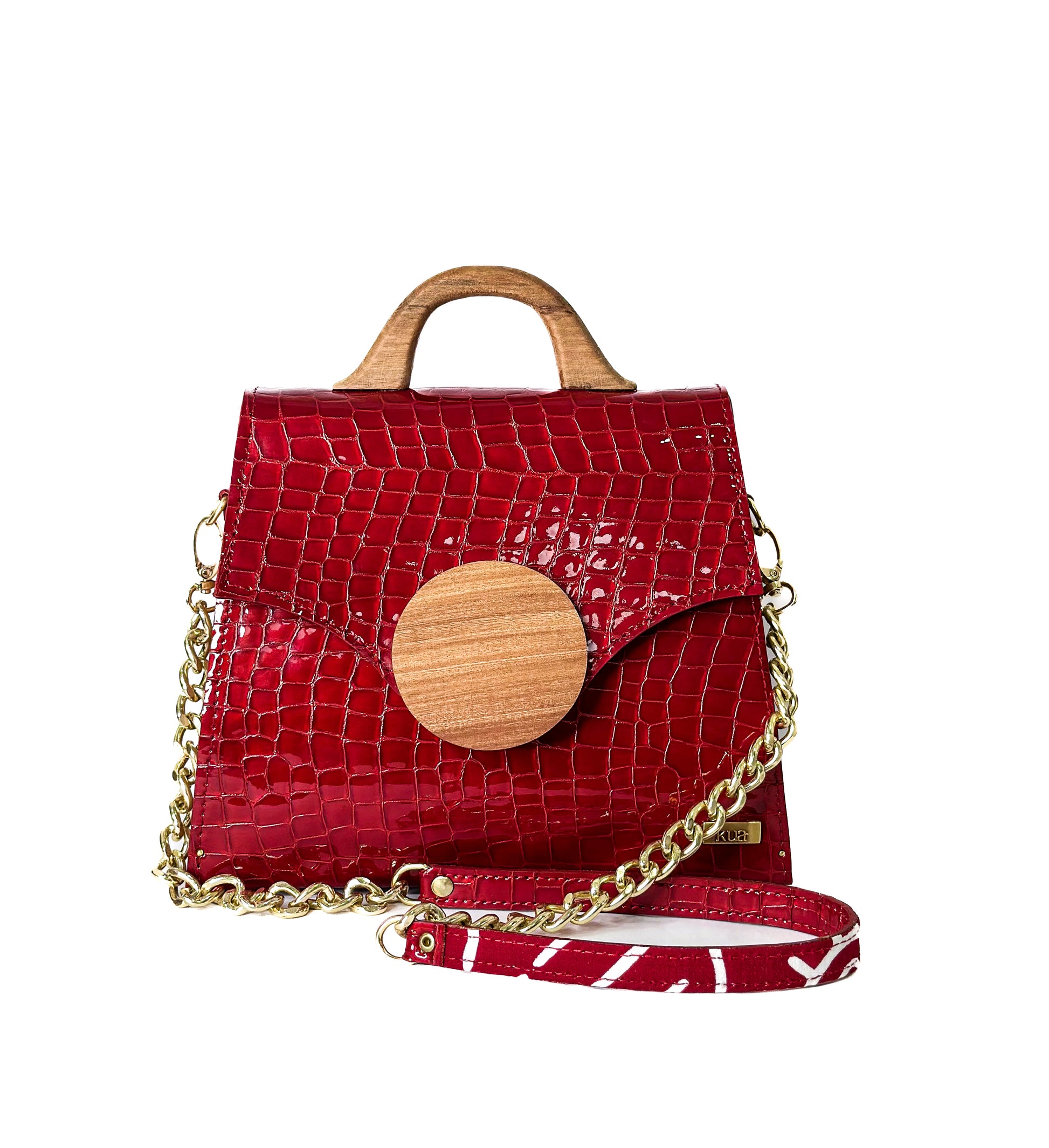 The bold yet refined silhouette is balanced by a wooden handle that feels as good as it looks, while a gold chain strap wrapped in African print fabric adds versatility and soul to the design.