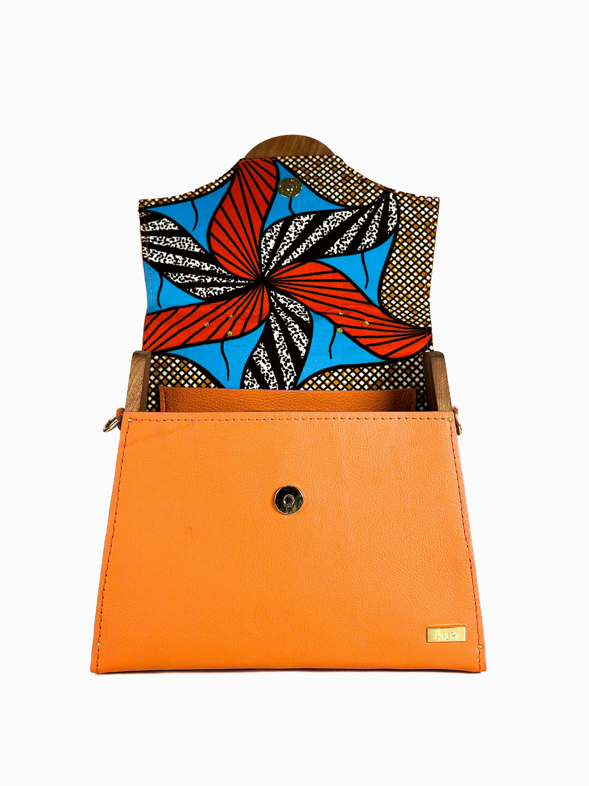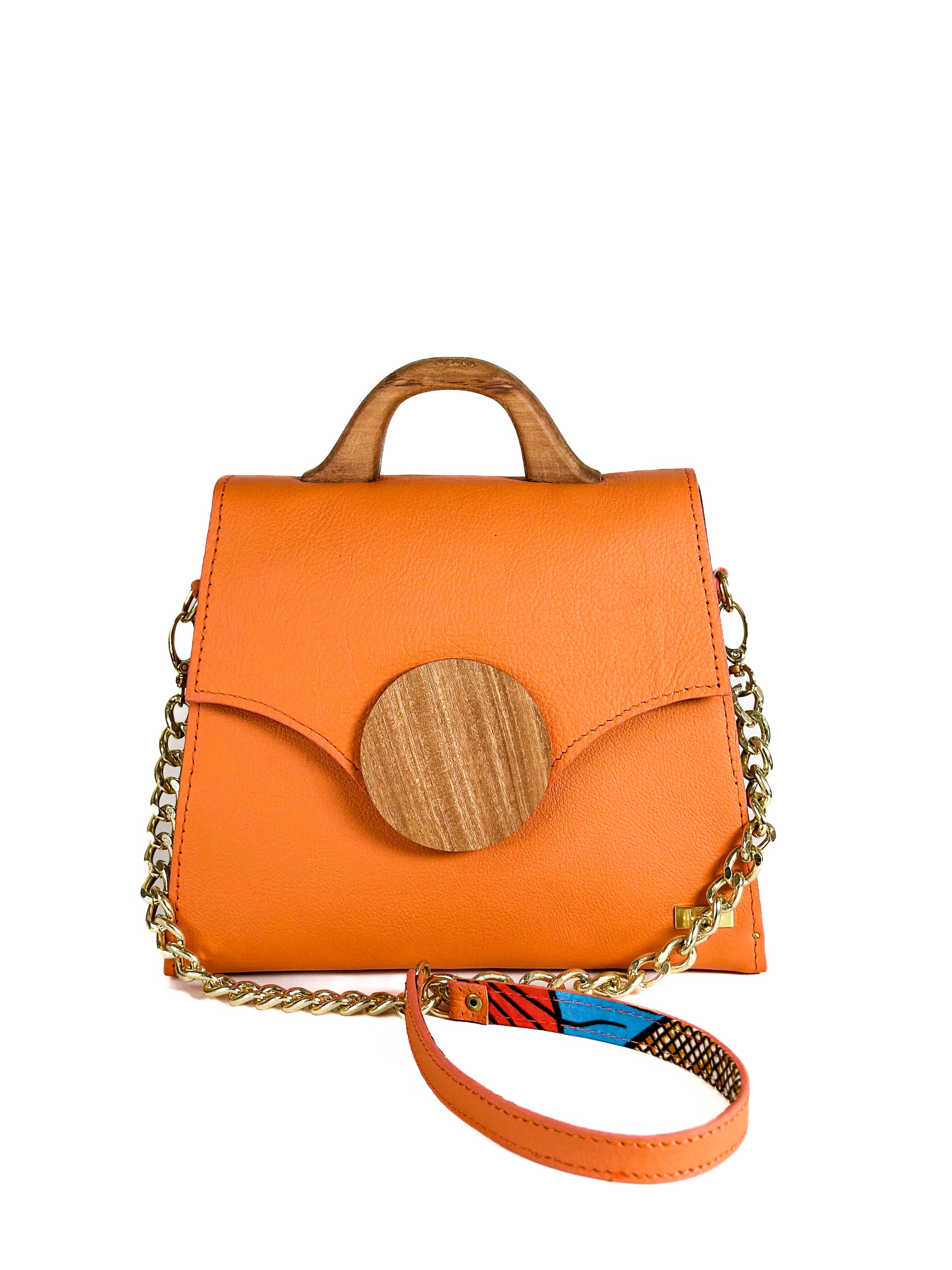 The bold yet refined silhouette is balanced by a wooden handle that feels as good as it looks, while a gold chain strap wrapped in African print fabric adds versatility and soul to the design.