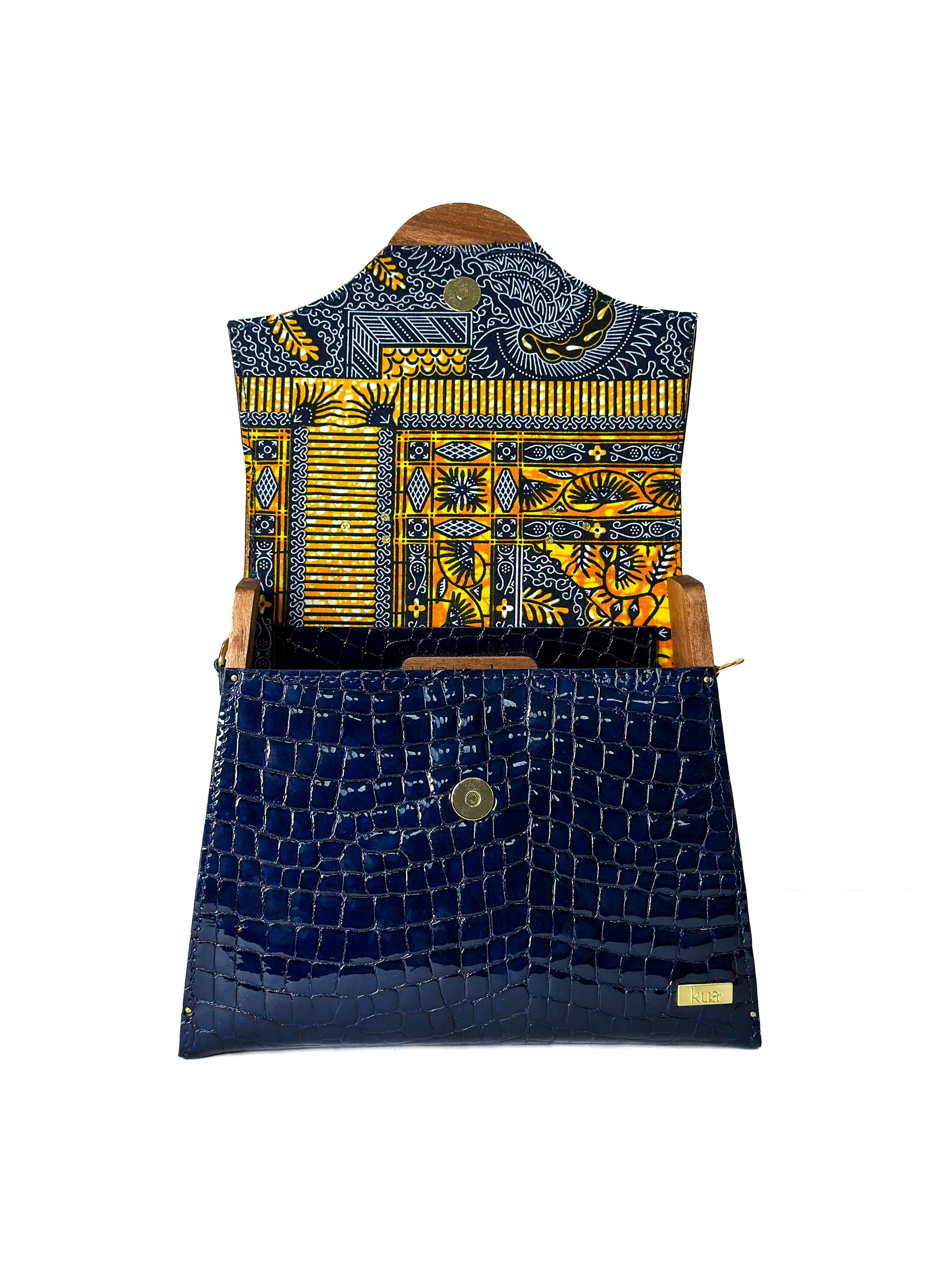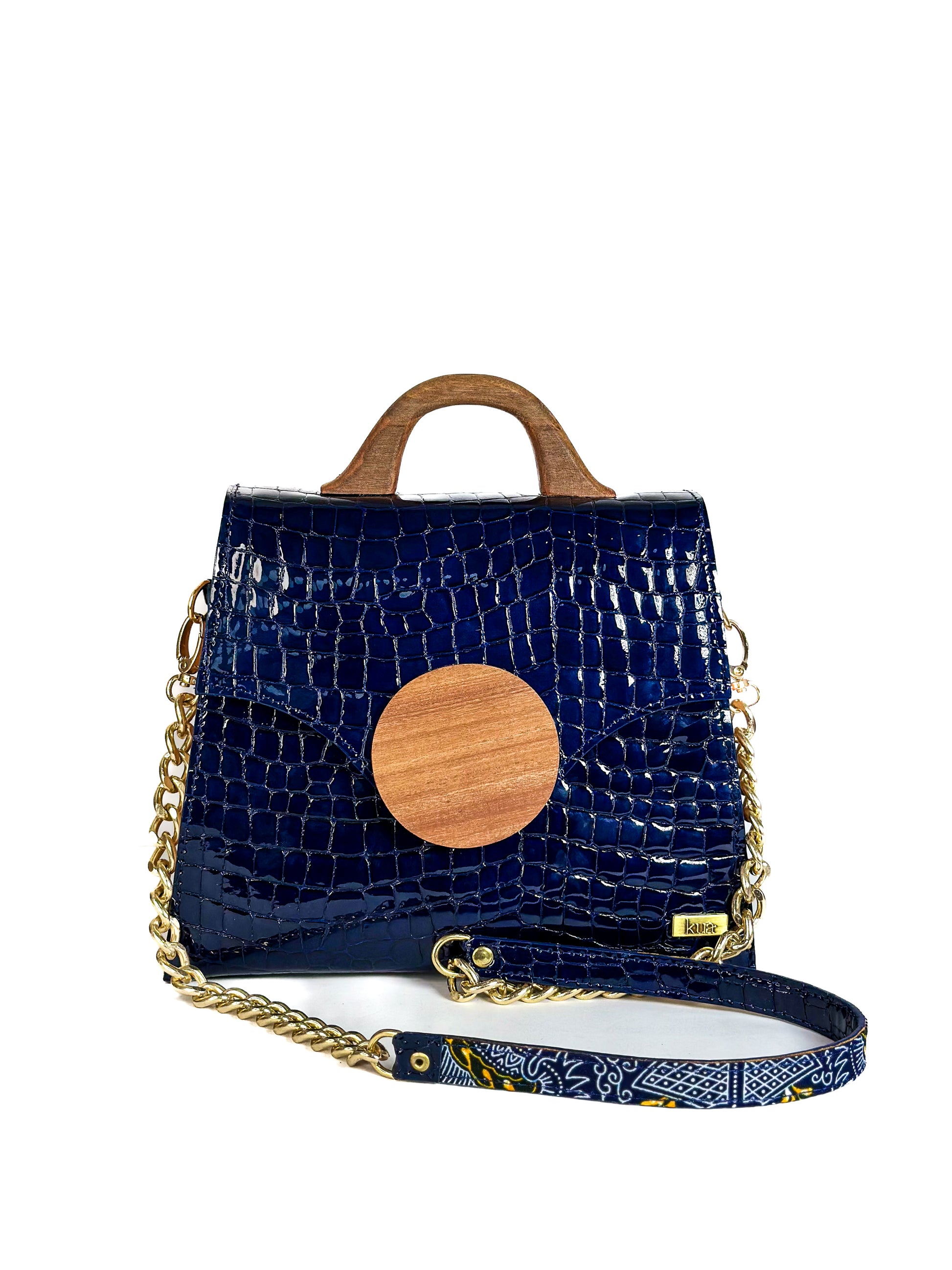 The bold yet refined silhouette is balanced by a wooden handle that feels as good as it looks, while a gold chain strap wrapped in African print fabric adds versatility and soul to the design.