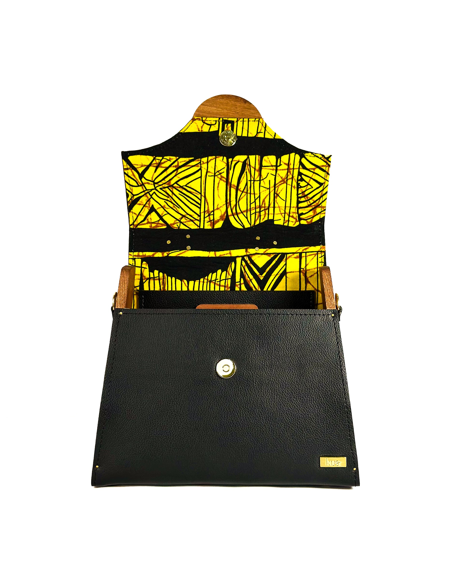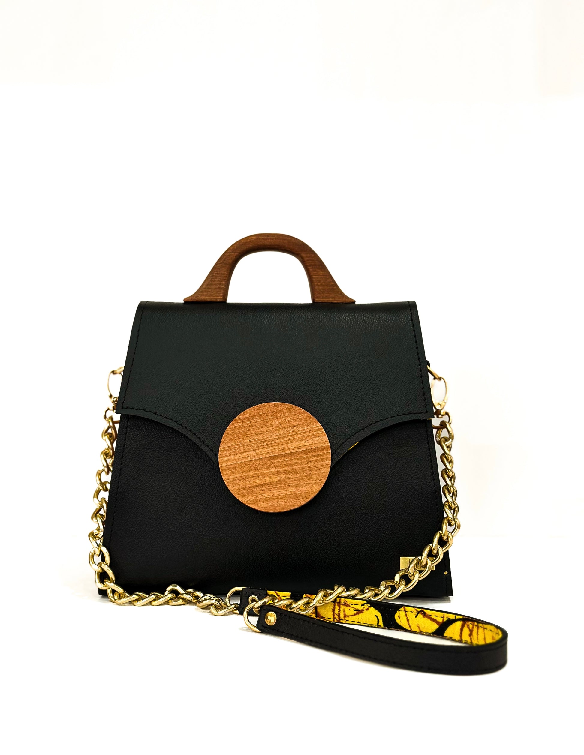The bold yet refined silhouette is balanced by a wooden handle that feels as good as it looks, while a gold chain strap wrapped in African print fabric adds versatility and soul to the design.