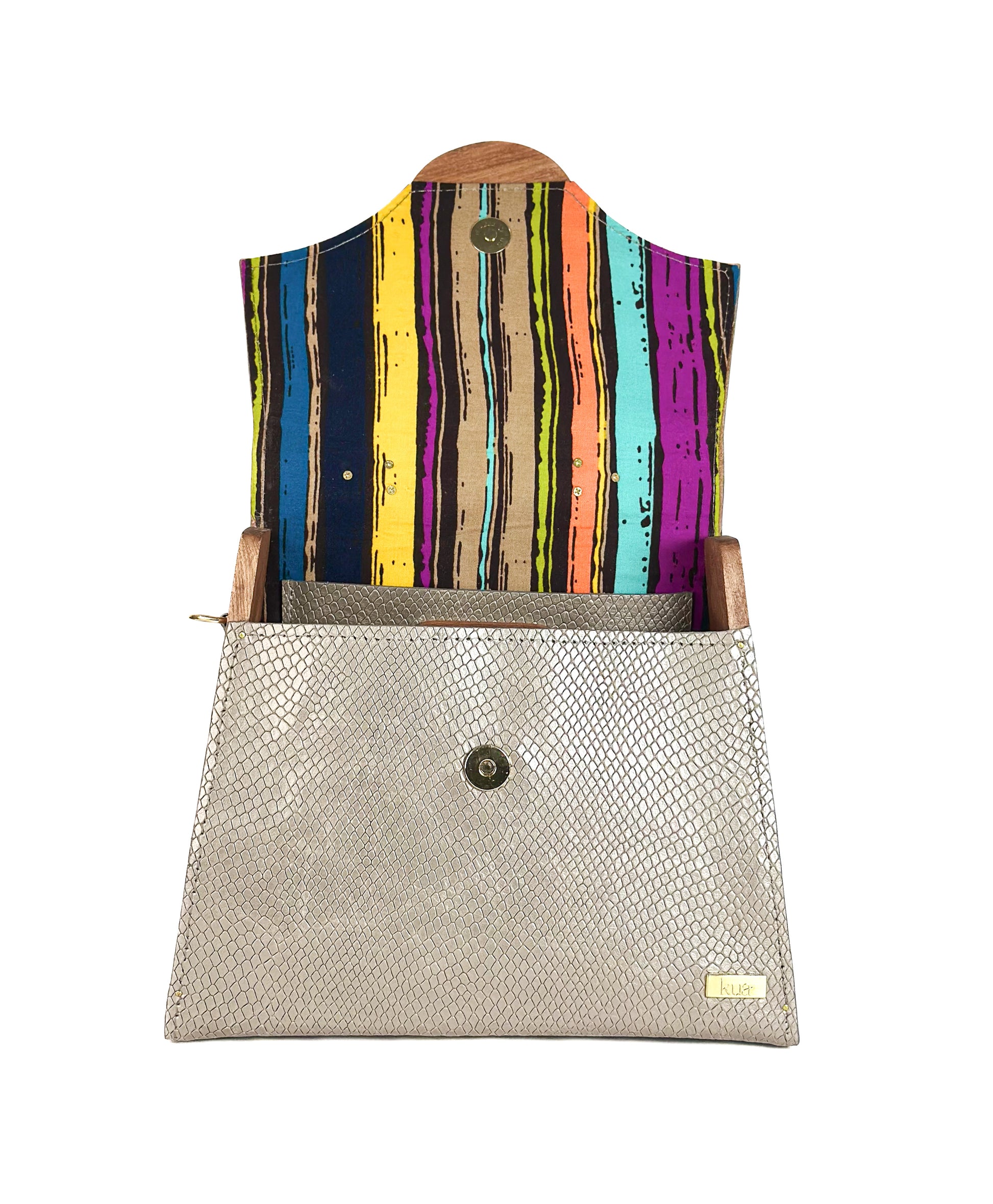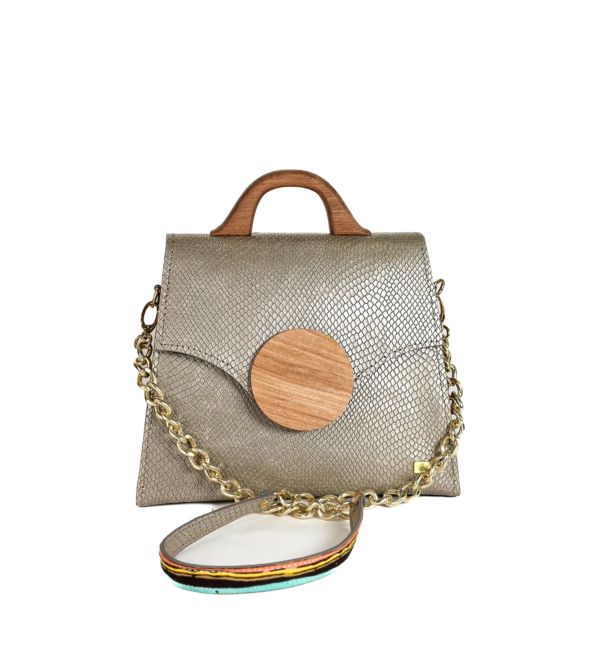 The bold yet refined silhouette is balanced by a wooden handle that feels as good as it looks, while a gold chain strap wrapped in African print fabric adds versatility and soul to the design.