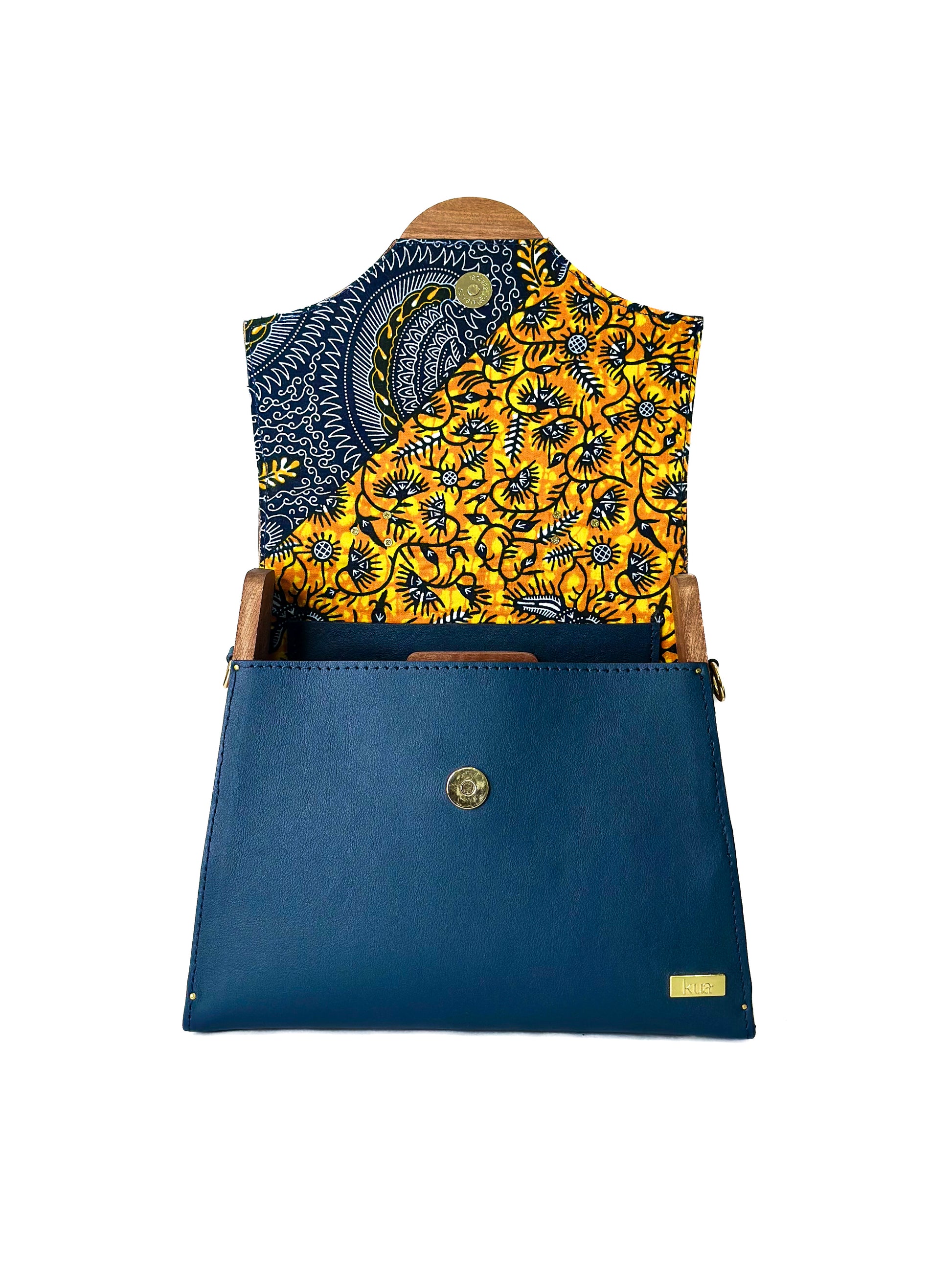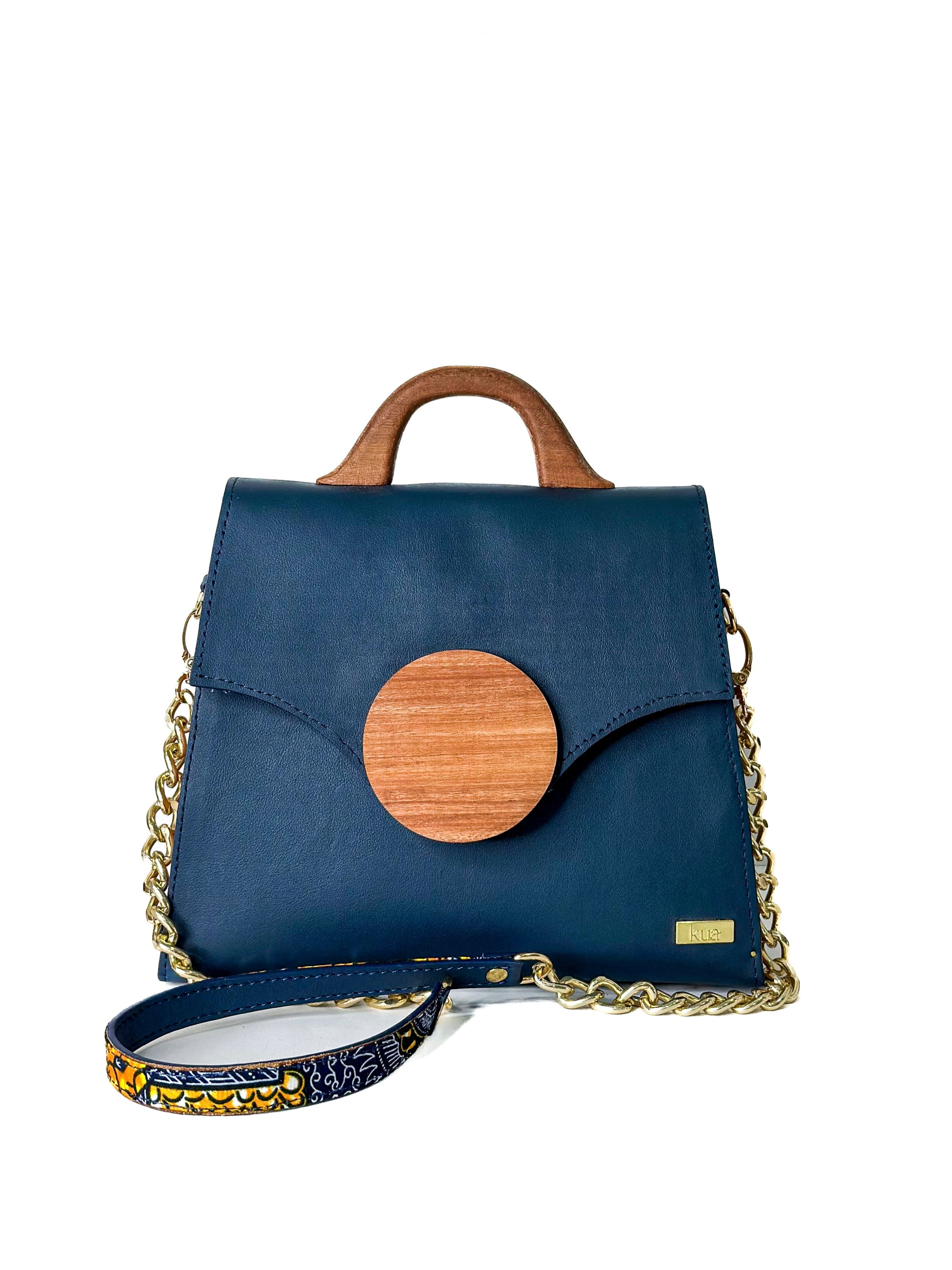 The bold yet refined silhouette is balanced by a wooden handle that feels as good as it looks, while a gold chain strap wrapped in African print fabric adds versatility and soul to the design.