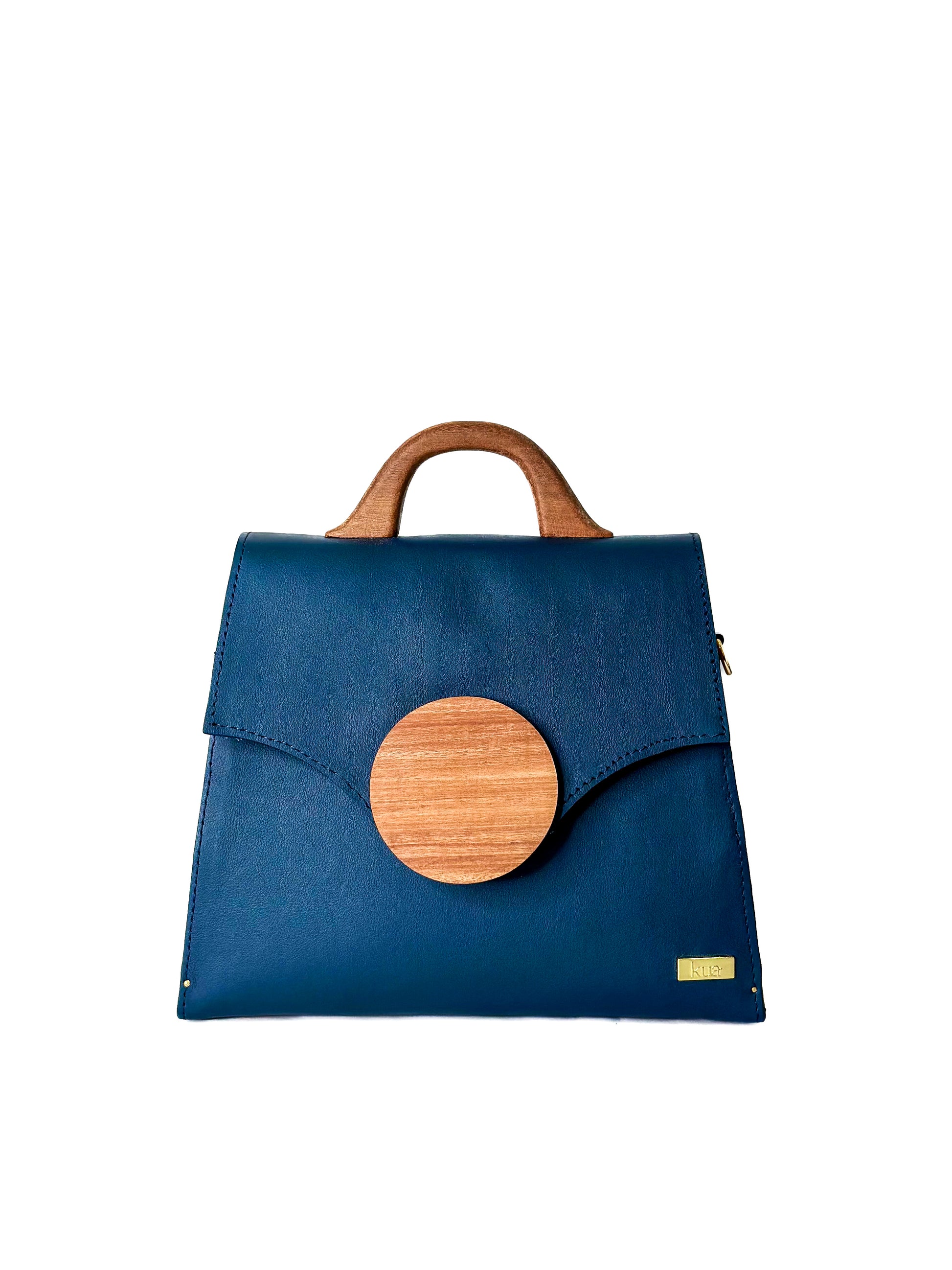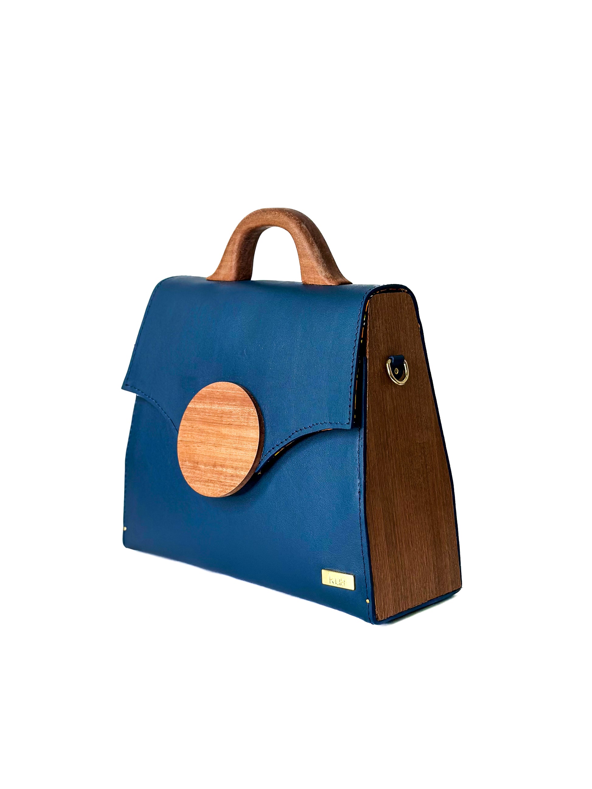 - Exterior: Navy blue genuine leather accented by guarea wood emblem