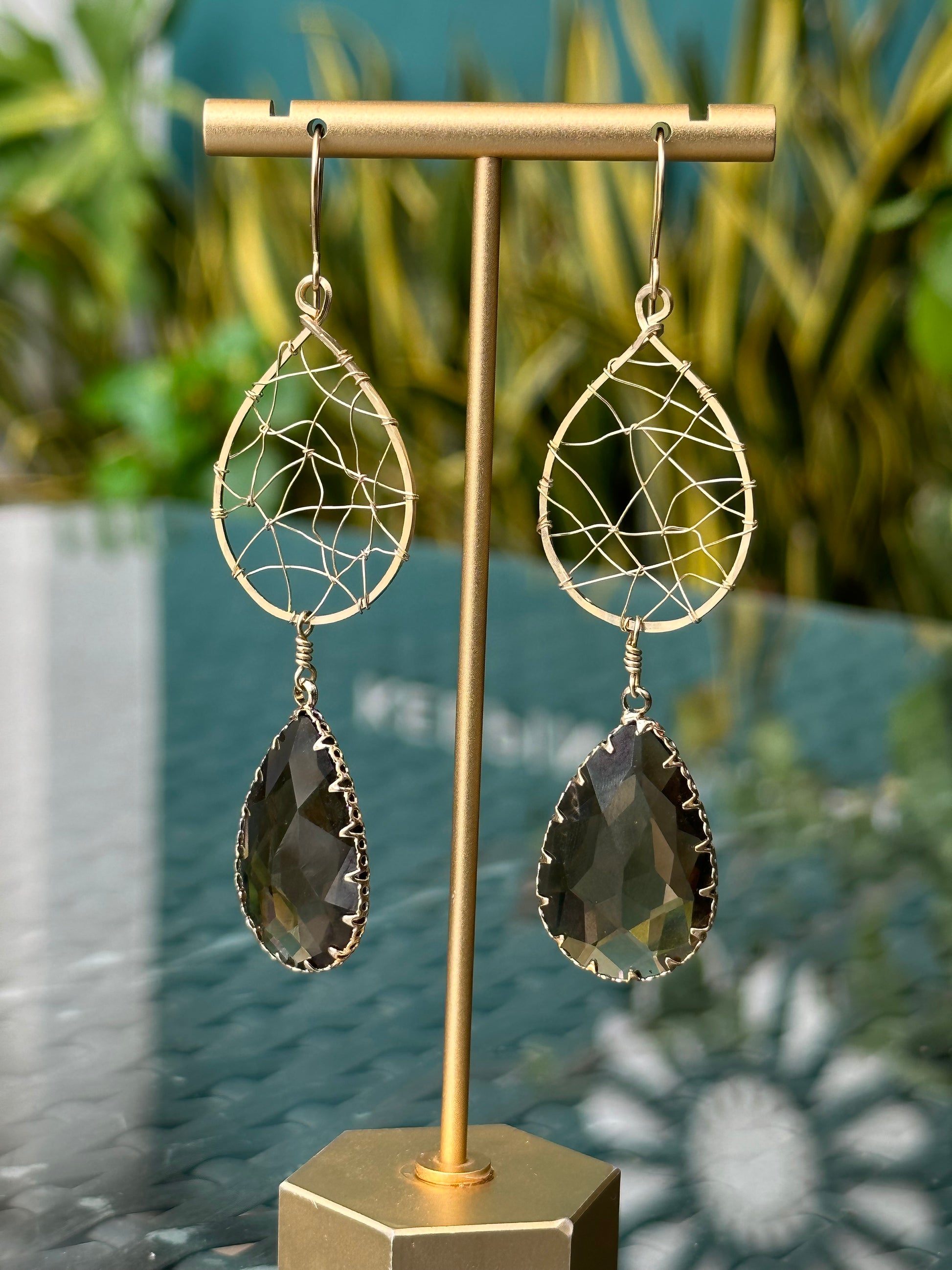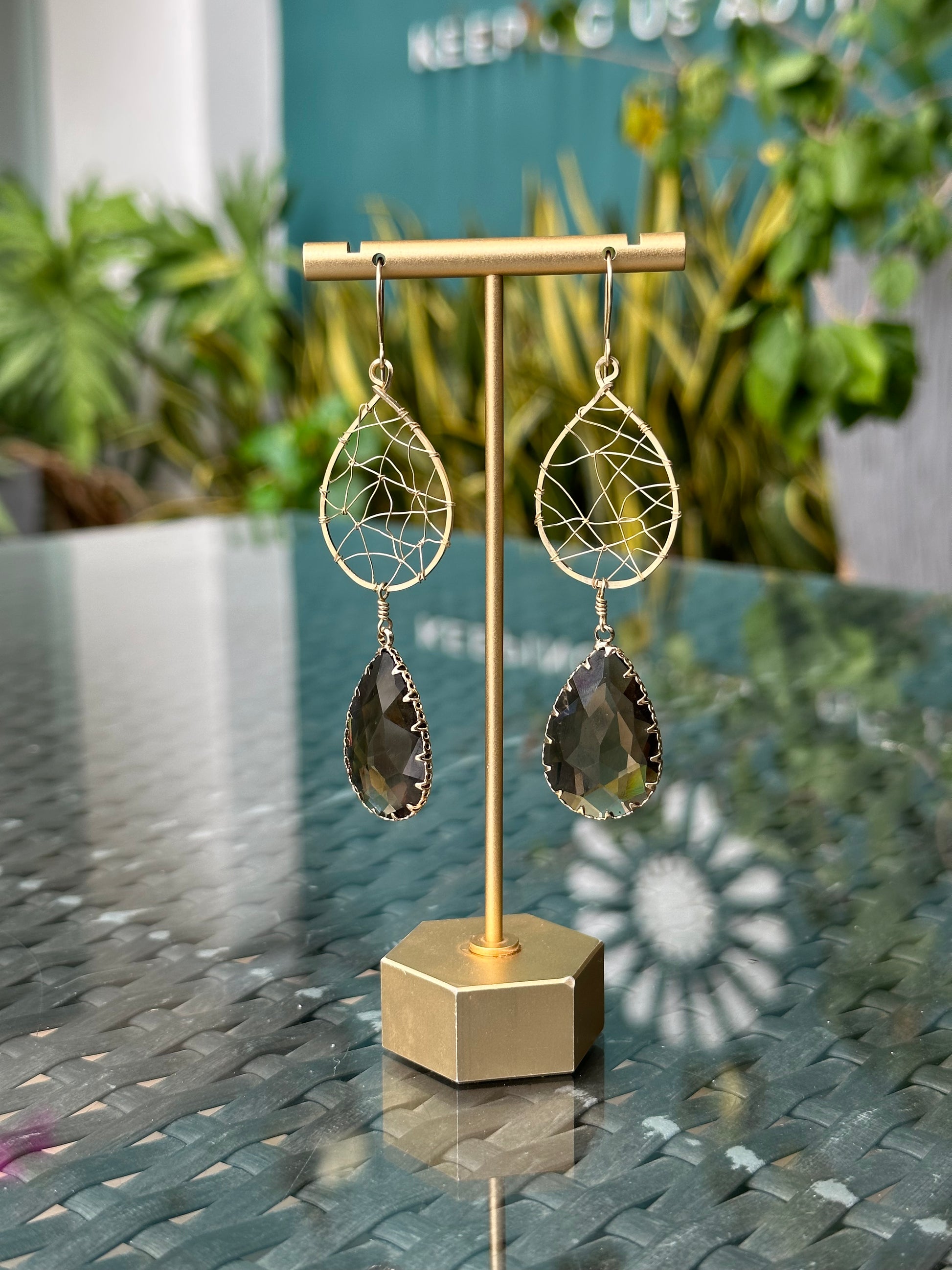 Experience timeless elegance with our hand-shaped teardrop earrings, featuring intricate freestyle wire weaving,elegantly adorned with mesmerizing faceted smoky heat-treated crystals.