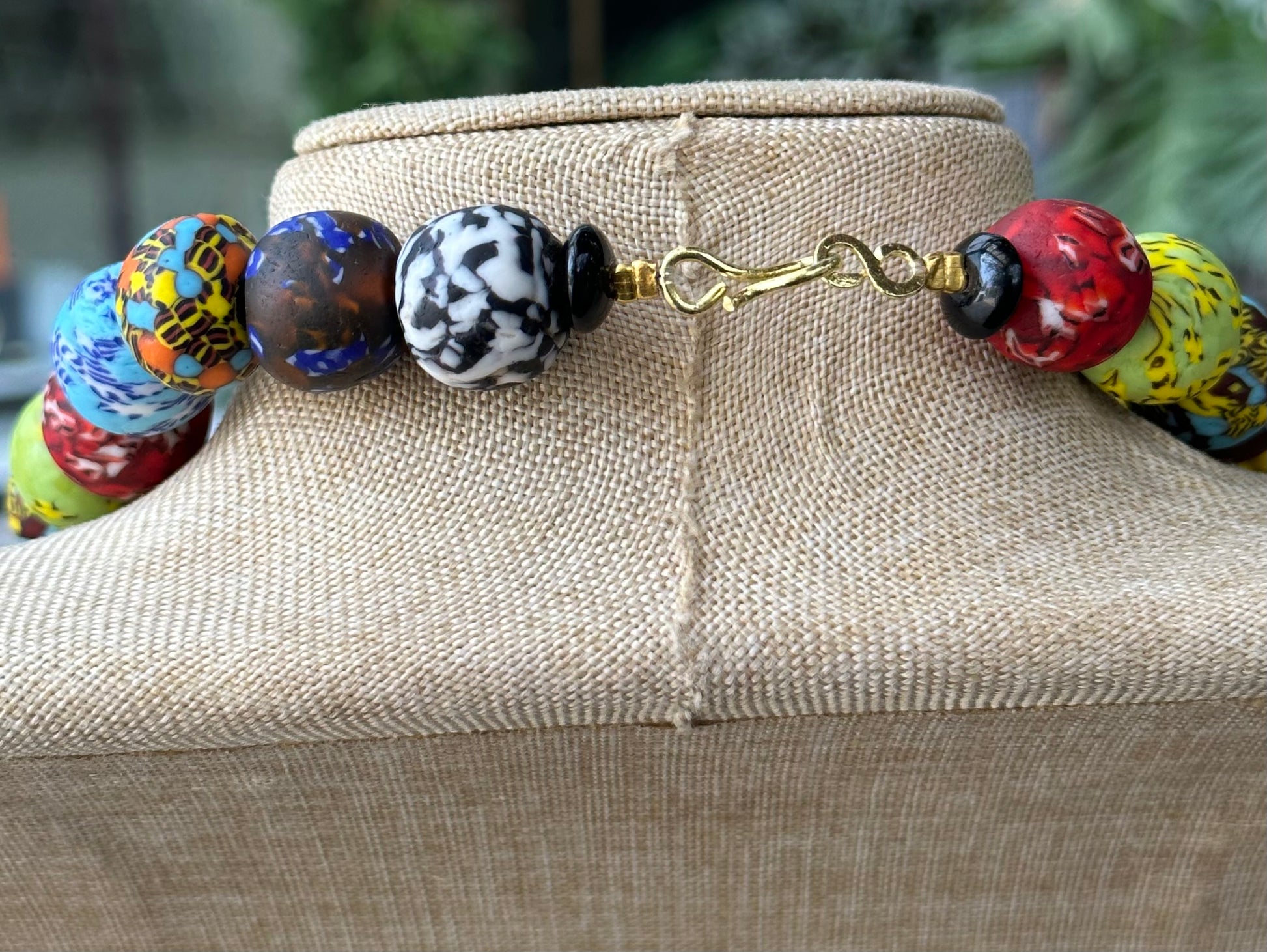 Material: Seed beads, recycled glass beads, cow horn, brass components.