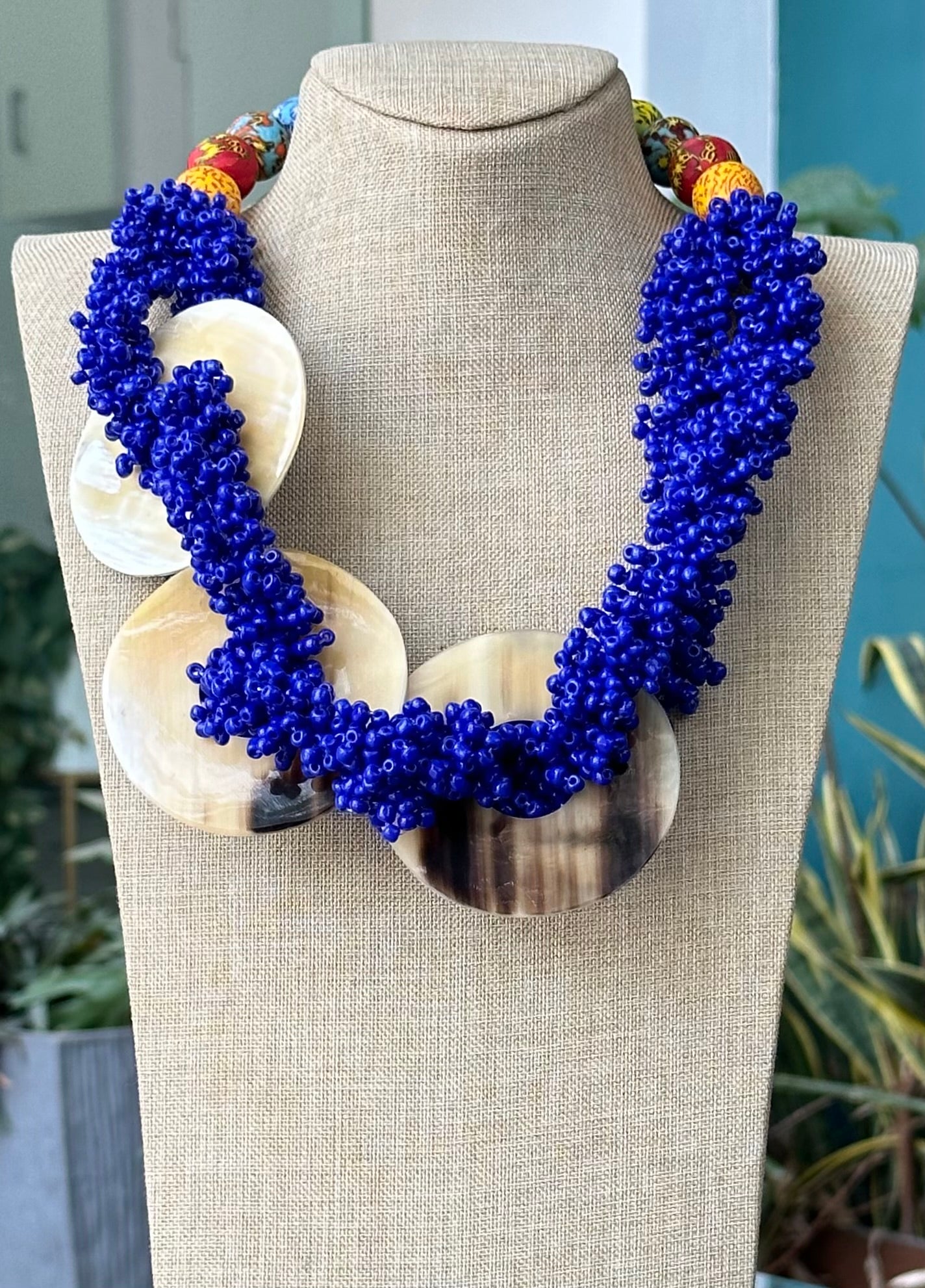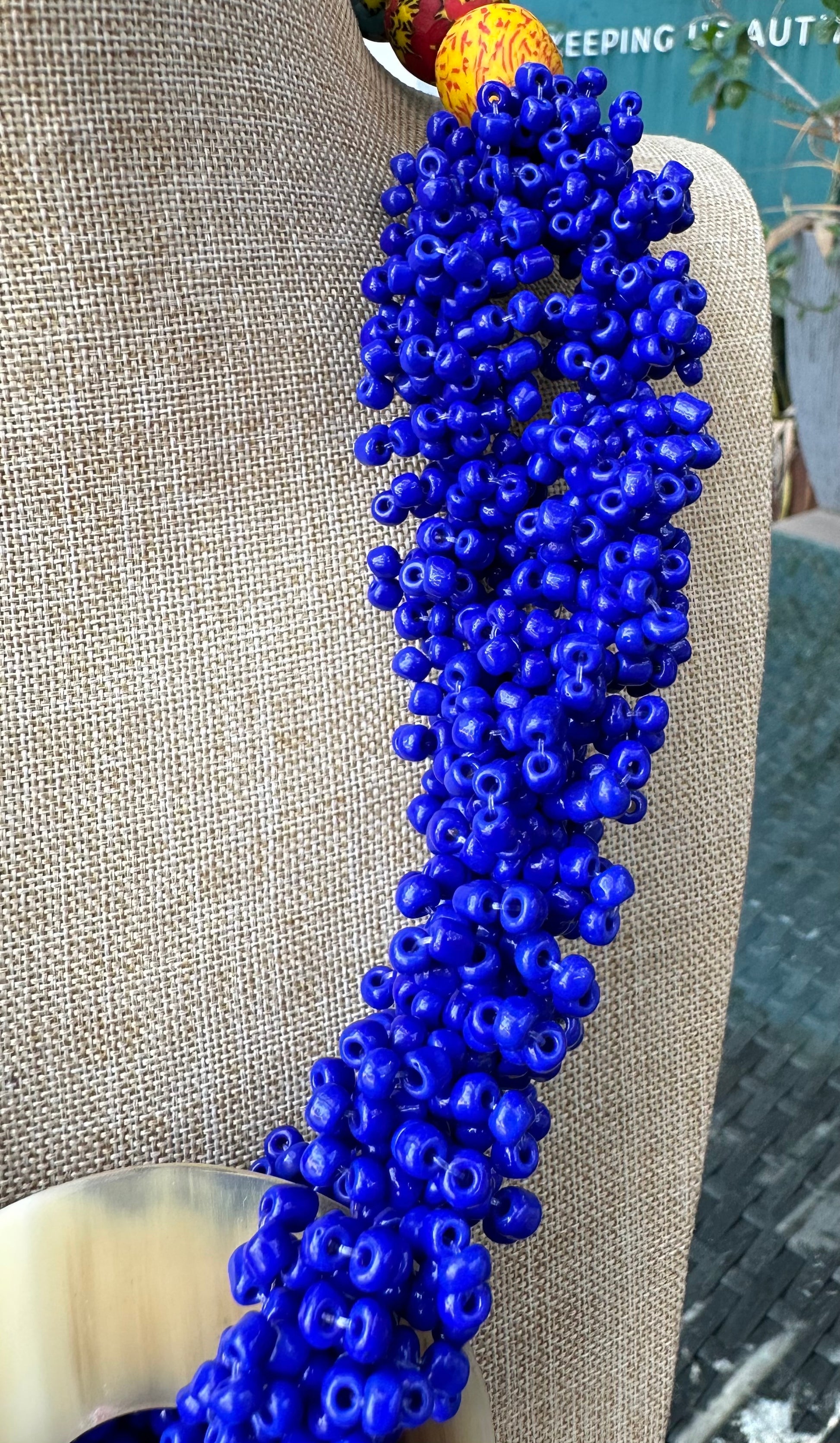 A stunning way to show off your style, this Fafa Setor Necklace from our FAFA COLLECTION features blue seed beads and round cow horn ornaments for an elegant design. Show off your glamourous look with this statement piece.
