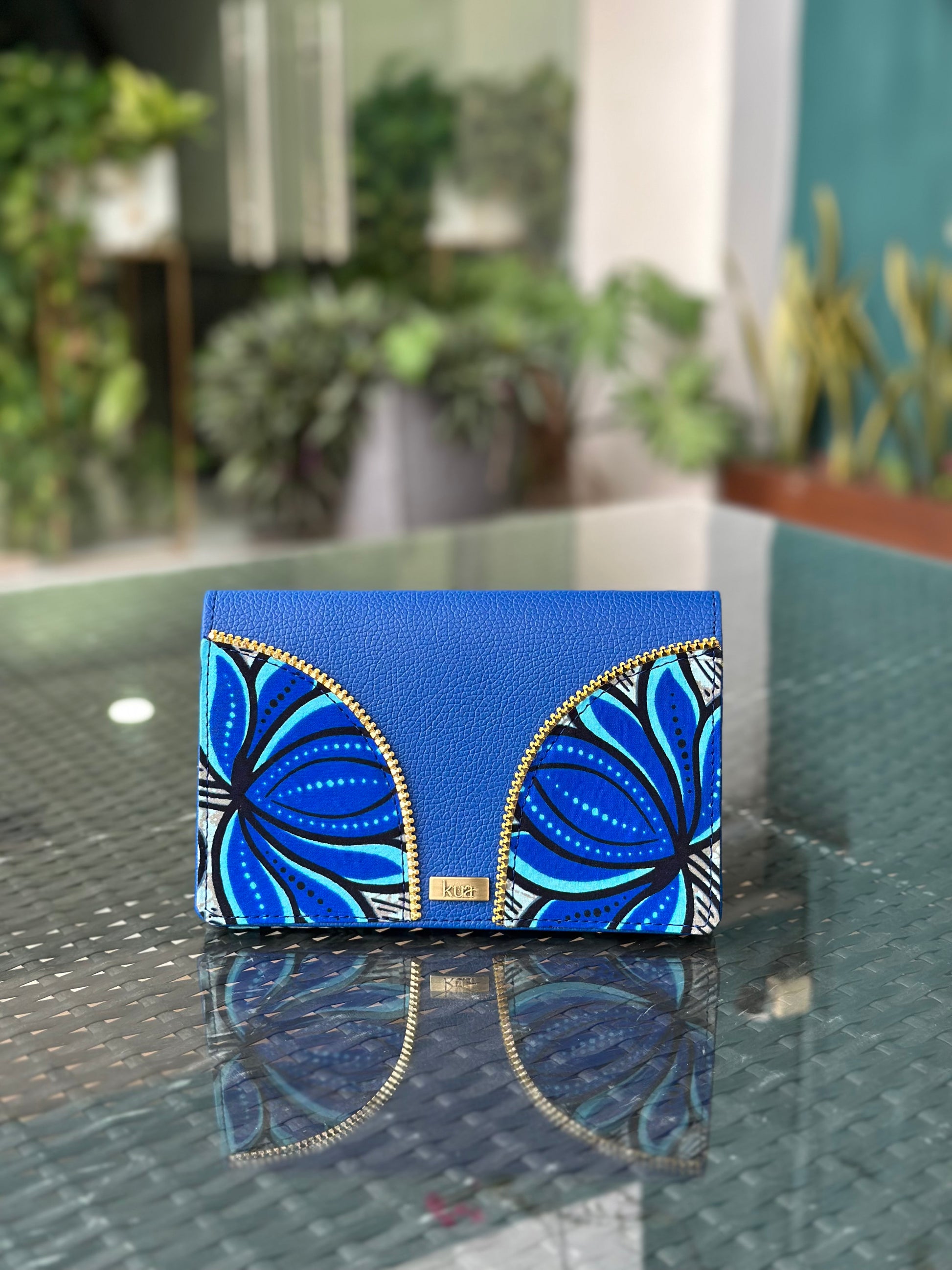 - Exterior: Royal blue leather accented by blue and white African print fabric