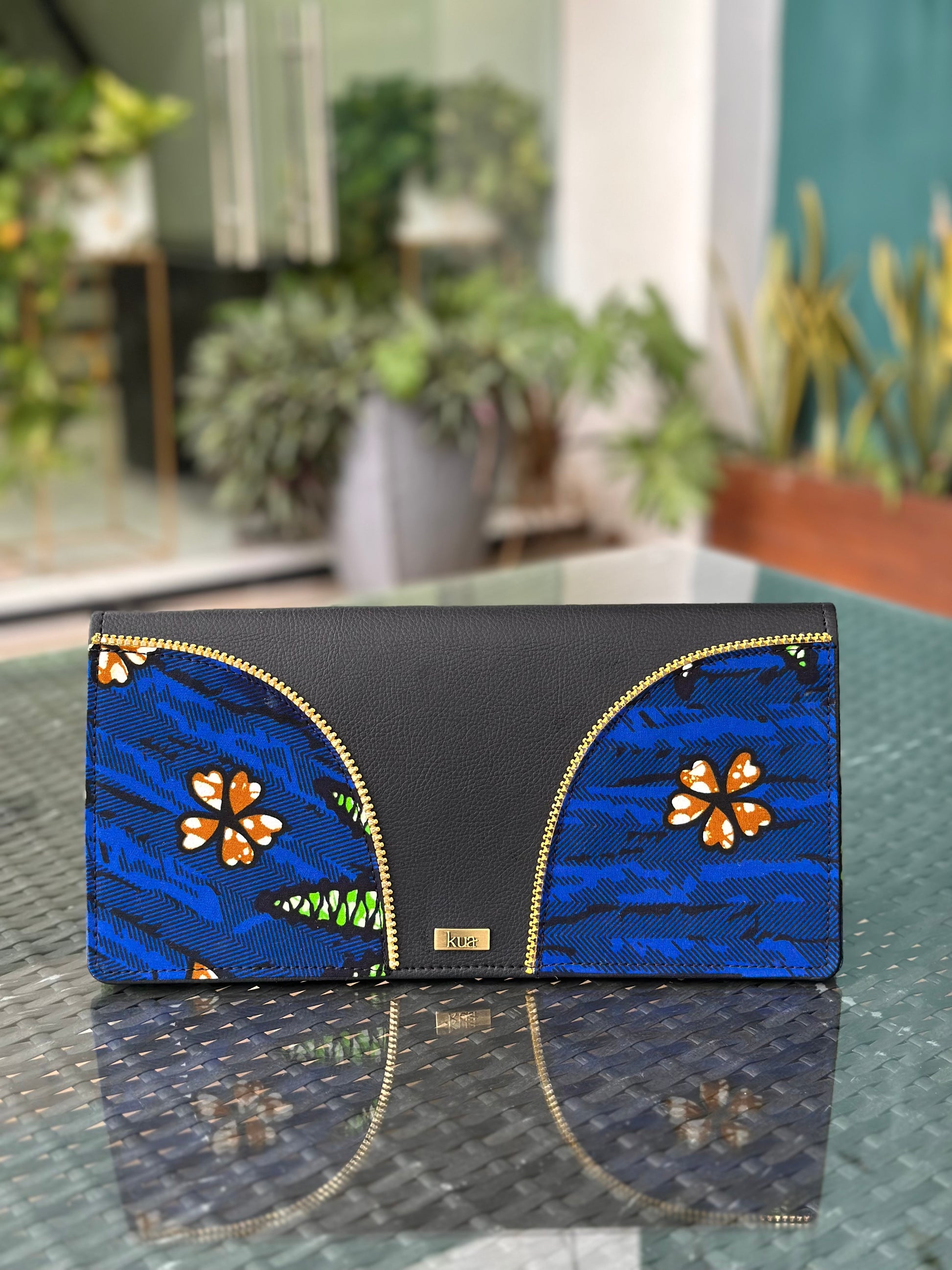 Make a fearless fashion statement with this eye-catching Black clutch, designed to steal the spotlight. The curved floral panels burst with vibrant blue and green leaves beautifully framed with golden touch of glam. This piece effortlessly fuses tradition with modern edge. Whether it’s a wedding, cocktail event, or dinner date, this clutch is your go-to for confident elegance.